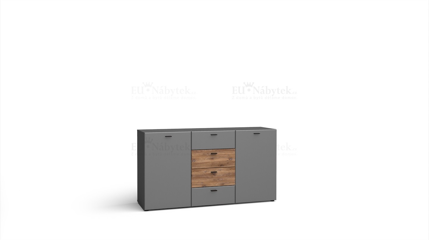 Komoda MILANES zdůrazňuje unikátní design nábytku. Stylová kompozice moderního nábytku zaručuje nejen reprezentativní zařízení daného interiéru, ale také i vysokou funkčnost, kterou ocení dokonce i nejnáročnější zákazníci. Spojení barev grafit mat a dub flagstaff viditelné na dvířkách obohatí užitnou plochu a zároveň rozzáří její celý prostor. Doplněním celé kompozice jsou černé úchyty, které zdůrazňují moderní styl v interiérovém designu. Dodáváme v demontu. V nabídce i v jiném barevném provedení.Také možnost zakoupení konferenčního stolku a obývací stěny ze stejné kolekce.