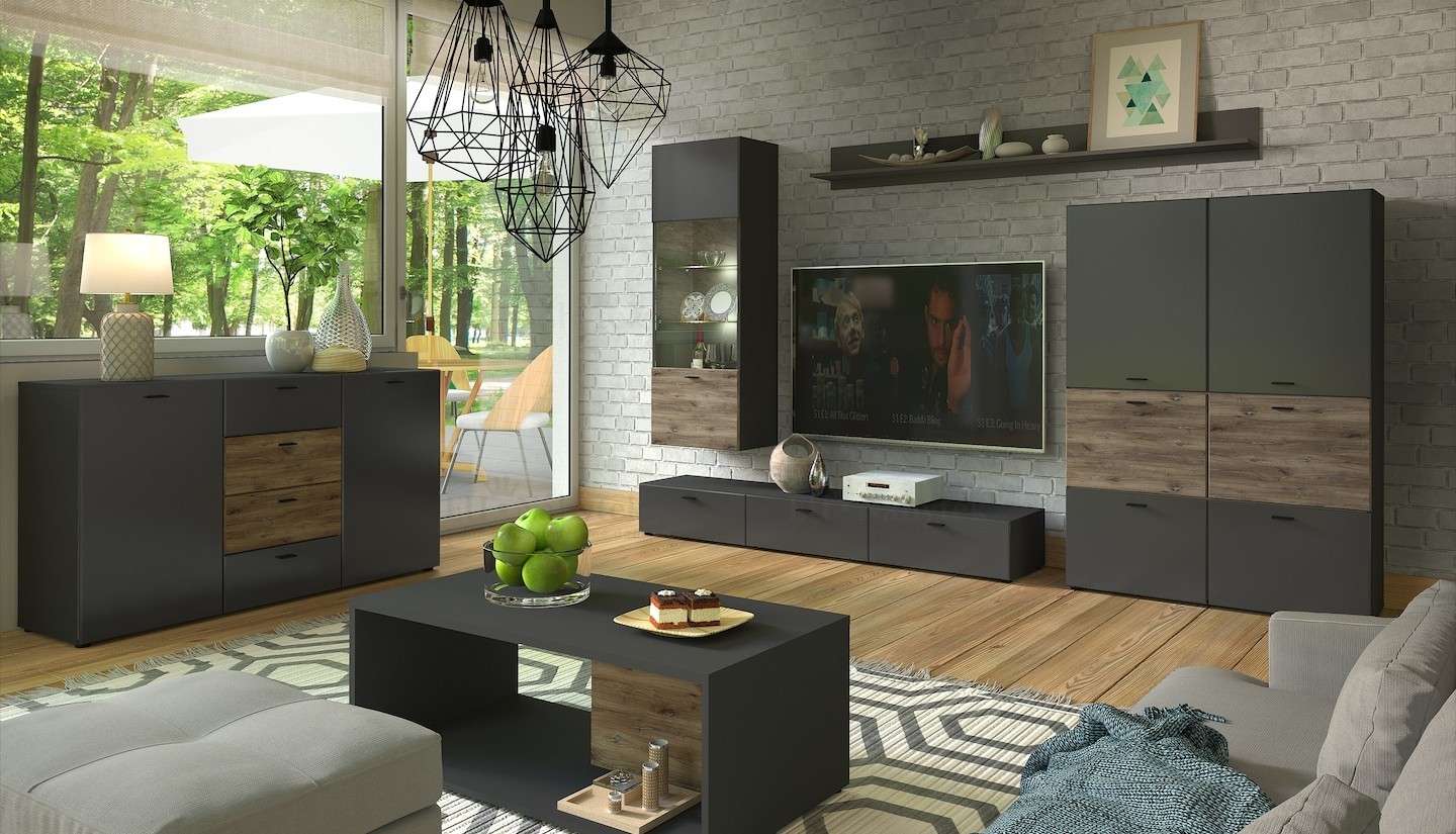 Konferenční stolek MILANES zdůrazňuje unikátní design nábytku. Stylová kompozice moderního nábytku zaručuje nejen reprezentativní zařízení daného interiéru, ale také i vysokou funkčnost, kterou ocení dokonce i nejnáročnější zákazníci. Spojení barev grafit mat a dub flagstaff obohatí a rozzáří celý váš prostor. Dodáváme v demontu. V nabídce i v jiném barevném provedení. Také možnost zakoupení komody a obývací stěny ze stejné kolekce.