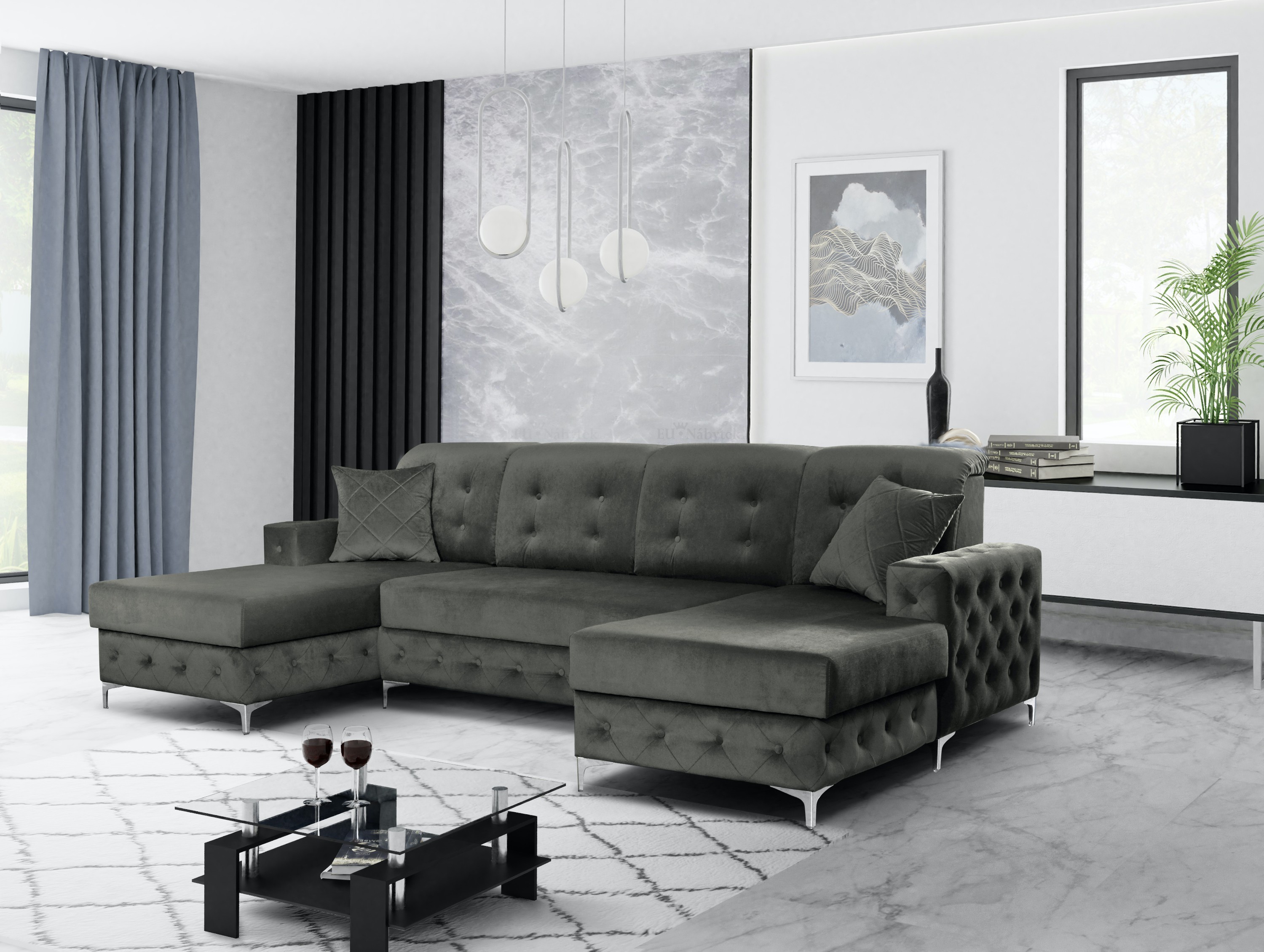 Velmi zajímavá moderní sedačka VERSAGE s velmi zajímavým propracováním. Netradiční a velmi moderní vzhled. Nadchne především milovníky velkého prostoru. Sedačka obsahuje také úložný prostor v bočních otomanech i prostor pro příležitostné spaní. Po rozložení vznikne spací plocha o rozměru 135x249cm. Kvalitní sezení zaručují pružiny Faliste spolu s vysokoelastickou PUR pěnou. Designovým doplnkěm jsou kovové chromované nožky a krystalové knoflíky s kvalitním prošíváním. Rozměry sedačky jsou 290x175x96cm. Čalouněná je kvalitní látkou Prestige 2772 . V nabídce i v jiném barevném provedení.