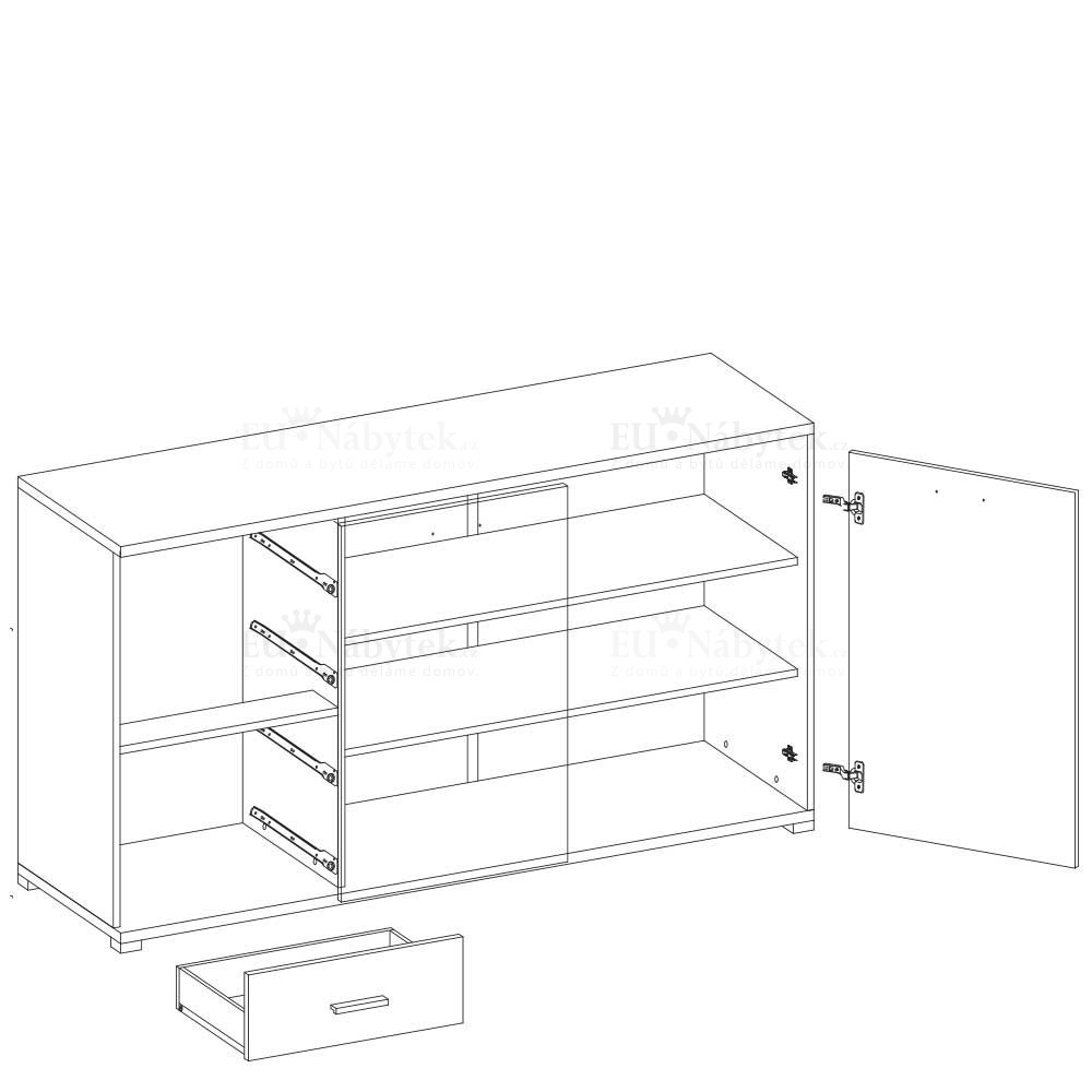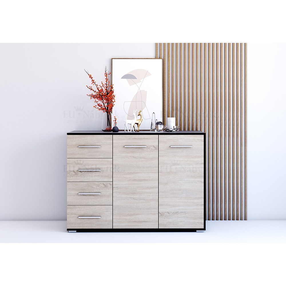 Moderní komoda FRODINO vyrobena z kvalitního lamina 16mm v provedení černá a dub sonoma. Vhodná je jak do obývacího pokoje tak například kanceláře. Komoda disponuje spoustou úložného prostoru díky čtyřem šuplíkům a prostorem se dvěmi policemi a naleznete ji hned v několika barvách na stránce. Rozměry jsou 135x95x45cm. Dodáváno v demontovaném stavu.