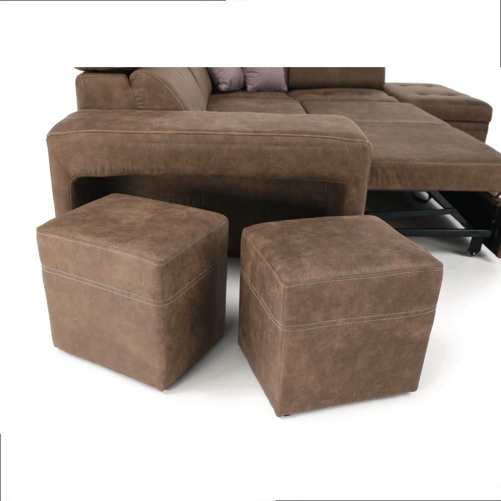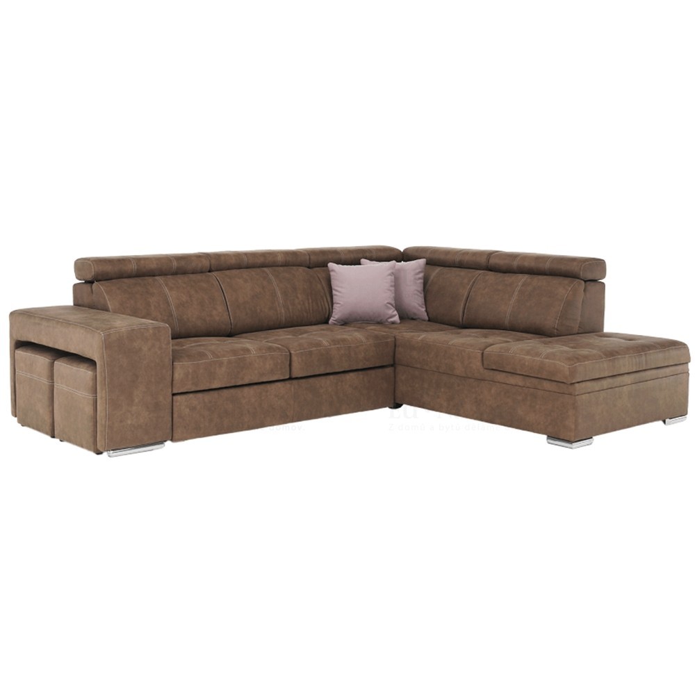 Moderní sedací souprava Lanzarote je ideální pro ty, kteří požadují komfort a vysoké pohodlí. Styl jejího provedení je velice nadčasový a svými liniemi zapadne do každého interiéru. Na sedáky jsou použity kvalitní pružiny typu Faliste spolu s vysokoelastickou PUR pěnou. Velkou výhodou jsou polohovatelné záhlavníky a područky.Jedinečnou je díky praktickým taburetům, které naleznete v boční područce sedačky. Díky tomuto praktickému místu Vám nebudou v místnosti zabírat místo a můžete je tak kdykoliv uschovat. Díky čalouněným zádům lze sedací soupravu umístit i volně do prostoru. Samozřejmostí je rozklad, díky kterému získáte plochu pro příležitostné spaní o rozměru 190x120cm. Čalouněná je kvalitní látkou Preston 24.