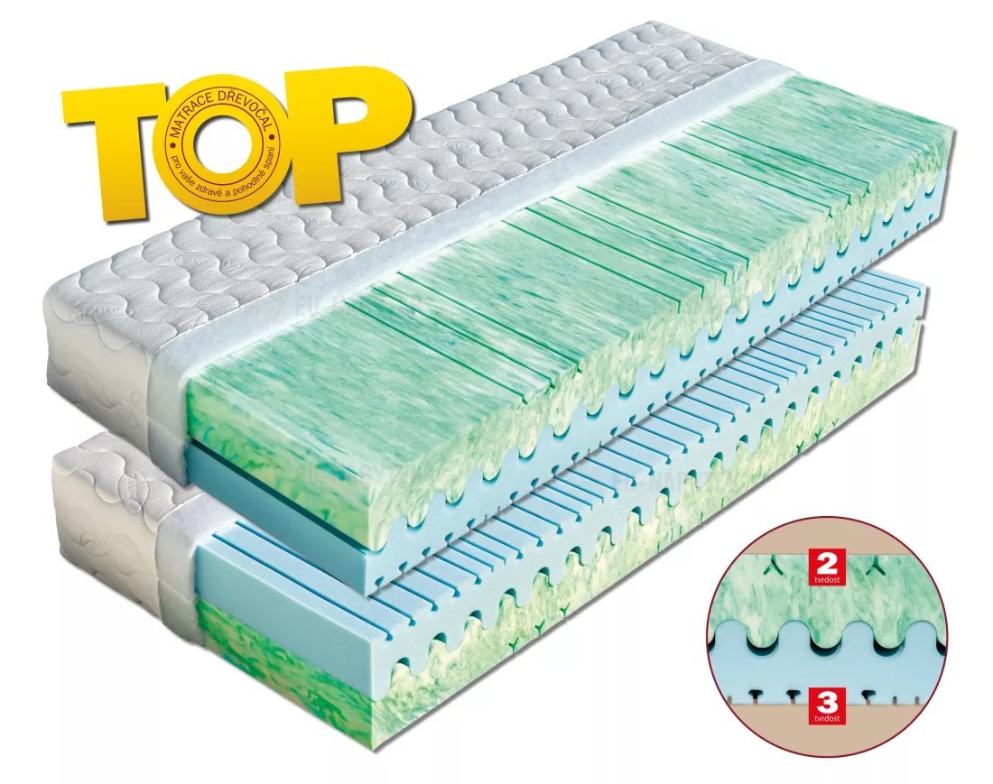 Luxusní matrace s výškou 25 cm Vás zaujme svou hráškově žíhanou pěnou MediFoam. Jedná se o komfortní pěnu (38 kg/m³) se speciálními vlastnostmi. Díky své dokonalé pružnosti se dokáže ideálně přizpůsobit všem detailům lidského těla. Modrá pěna MediFoam (35 kg/m³) s provzdušňujícími prořezy na druhé straně matrace má tvrdost č. 3. Obě pěny jsou velmi prodyšné a udržují jádro matrace vždy suché a odolné vůči mikroorganismům. Tyto dvě pěny jsou spojeny speciální vlnou, která matraci provzdušňuje. Při výrobě není použito lepidlo. Matrace je vhodná pro všechny typy roštů. Celková výška matrace cca 25 cm.