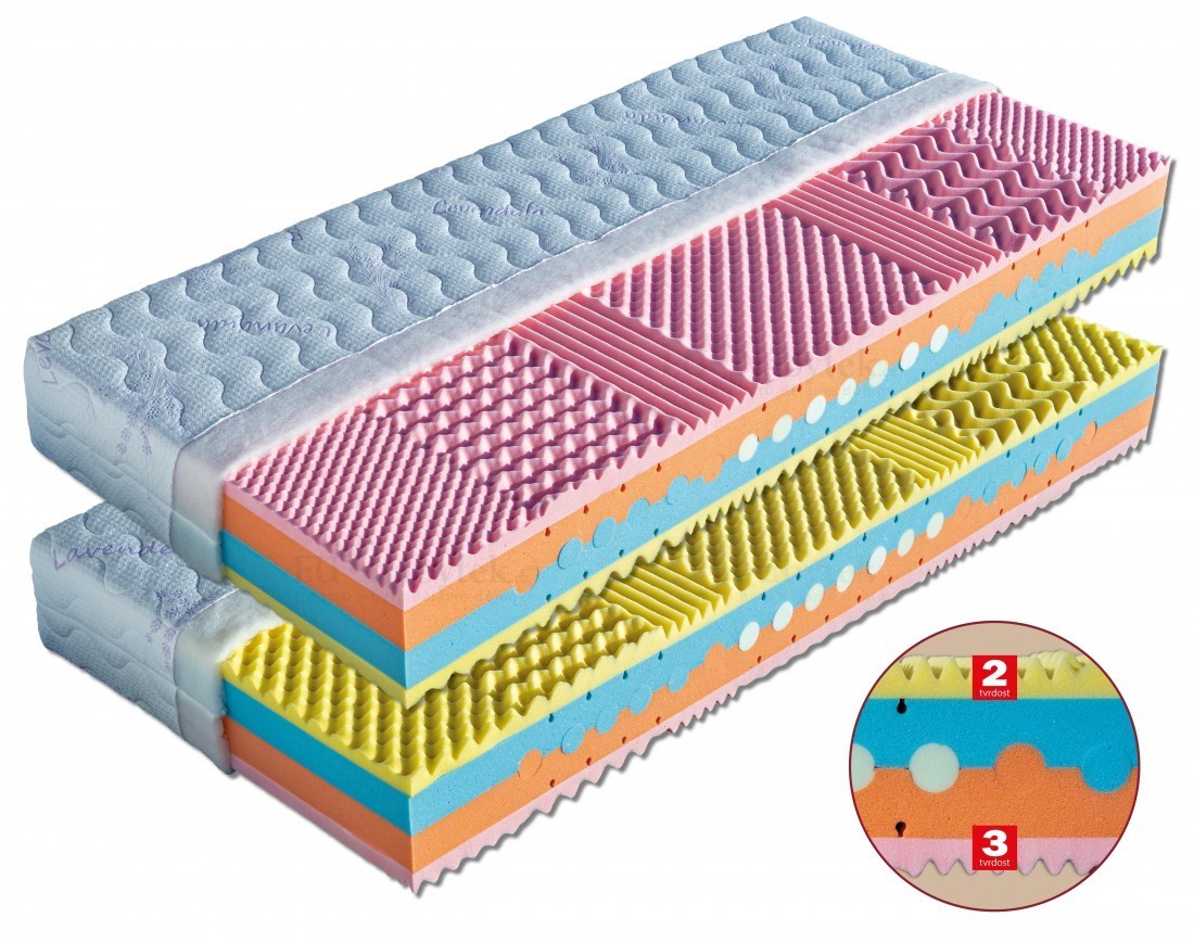 Luxusní matrace s provzdušněným jádrem ze studené pěny dvou tuhostí (40 a 45 kg/m³) a s vloženými válci ze studených pěn různých tuhostí (pod rameny nižší tuhosti, pod bedry vyšší). Oboustranná matrace, kde obě vrchní vrstvy tvoří viscoelastická pěna (45 kg/m³), která reaguje na tělesné teplo a přizpůsobuje se konturám těla spáče. To snižuje tlak na nejtěžší části těla a vytváří pocit beztíže. Ke zvýšení komfortu přispívá také tvarování pěny do masážních nopů zabezpečujících prokrvení pokožky a uvolnění svalů během spánku. Sedmizónové rozdělení nopů je důležité i ze zdravotního hlediska. Zatímco pod rameny oceníte měkčí zóny, pod bedry je potřeba mít pevnější podklad. Matraci je vhodné položit na pevný nebo polohovací lamelový rošt. Klinicky testováno. Celková výška matrace cca 23 cm.