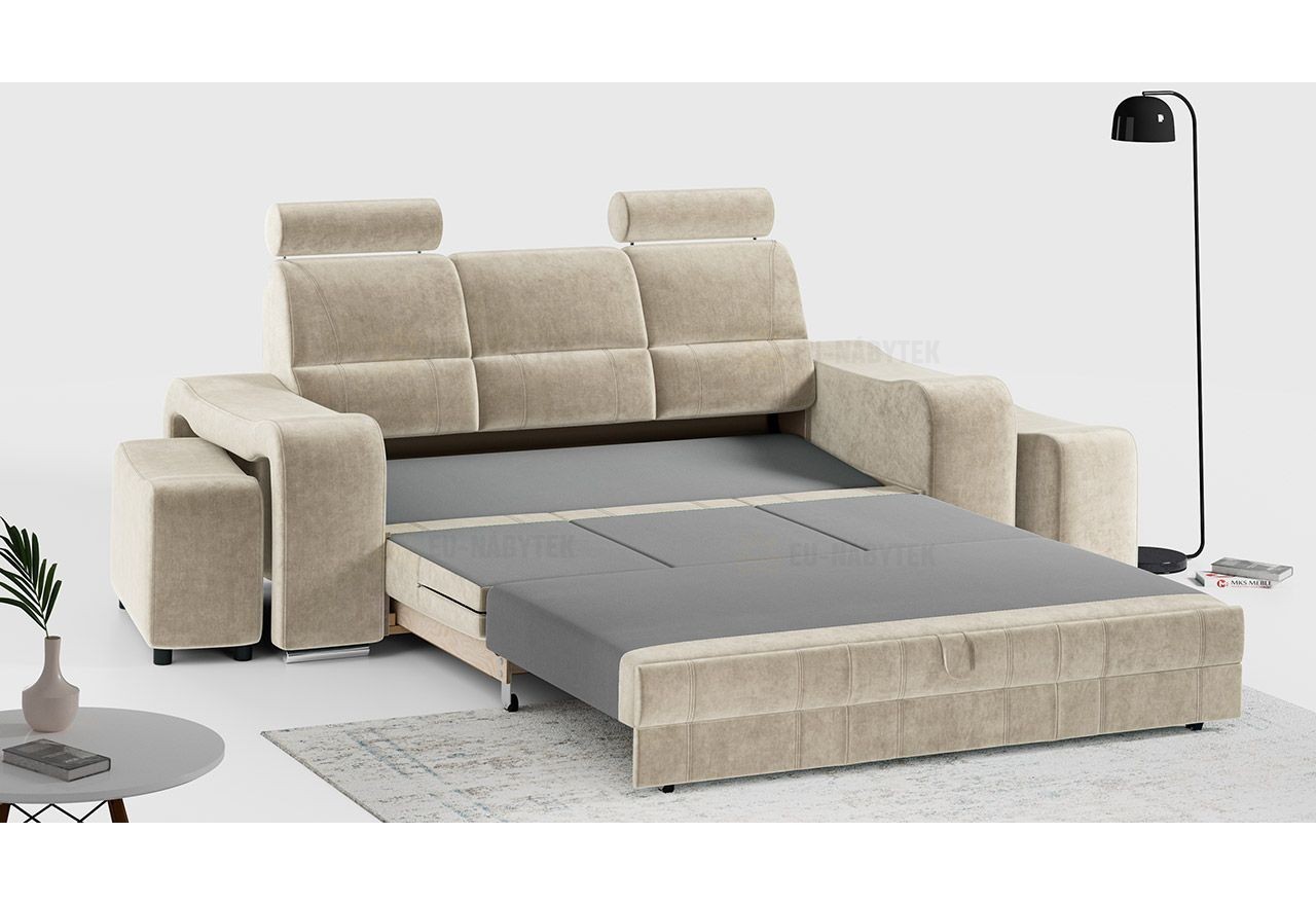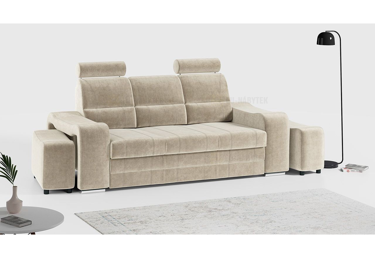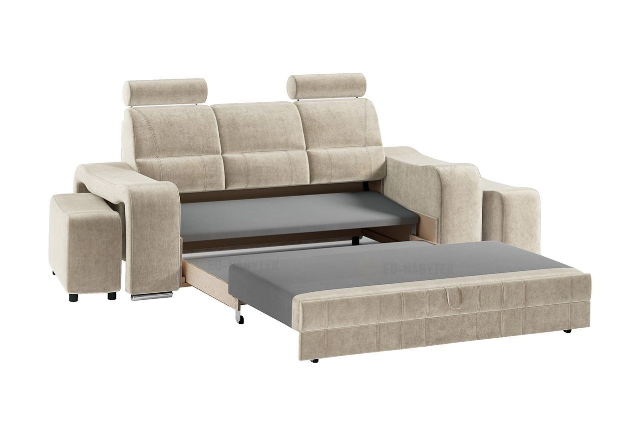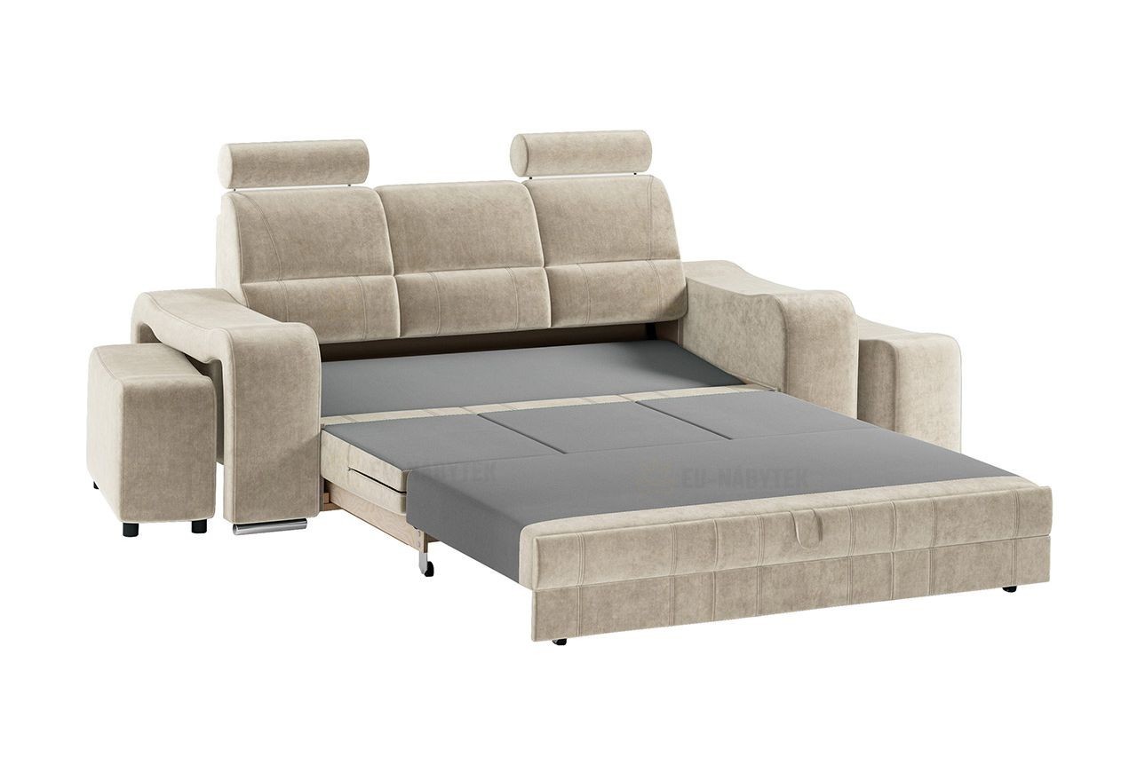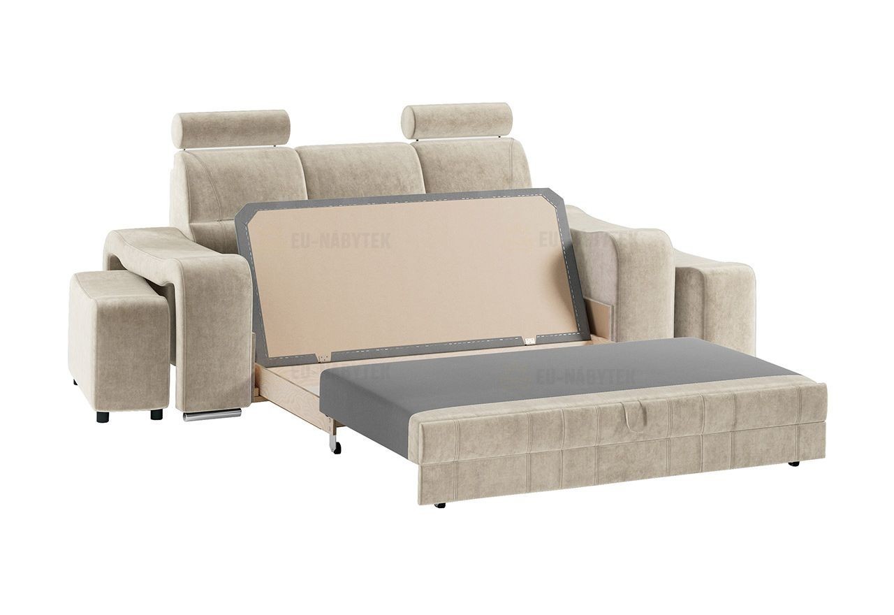 Praktická celočalouněná pohovka včetně dvou taburetů, které lze lehce zasunout do stran pohovky a ušetříte tím tak spoustu prostoru. Pohovka disponuje úložným prostorem a spací plochou, která má rozměry 148x197cm. Pohodlné sezení zaručují pružiny faliste a kvalitní PUR pěna T30. Čalouněná je kvalitní látkou Monolith 02. V nabídce naleznete i další barevné varianty.