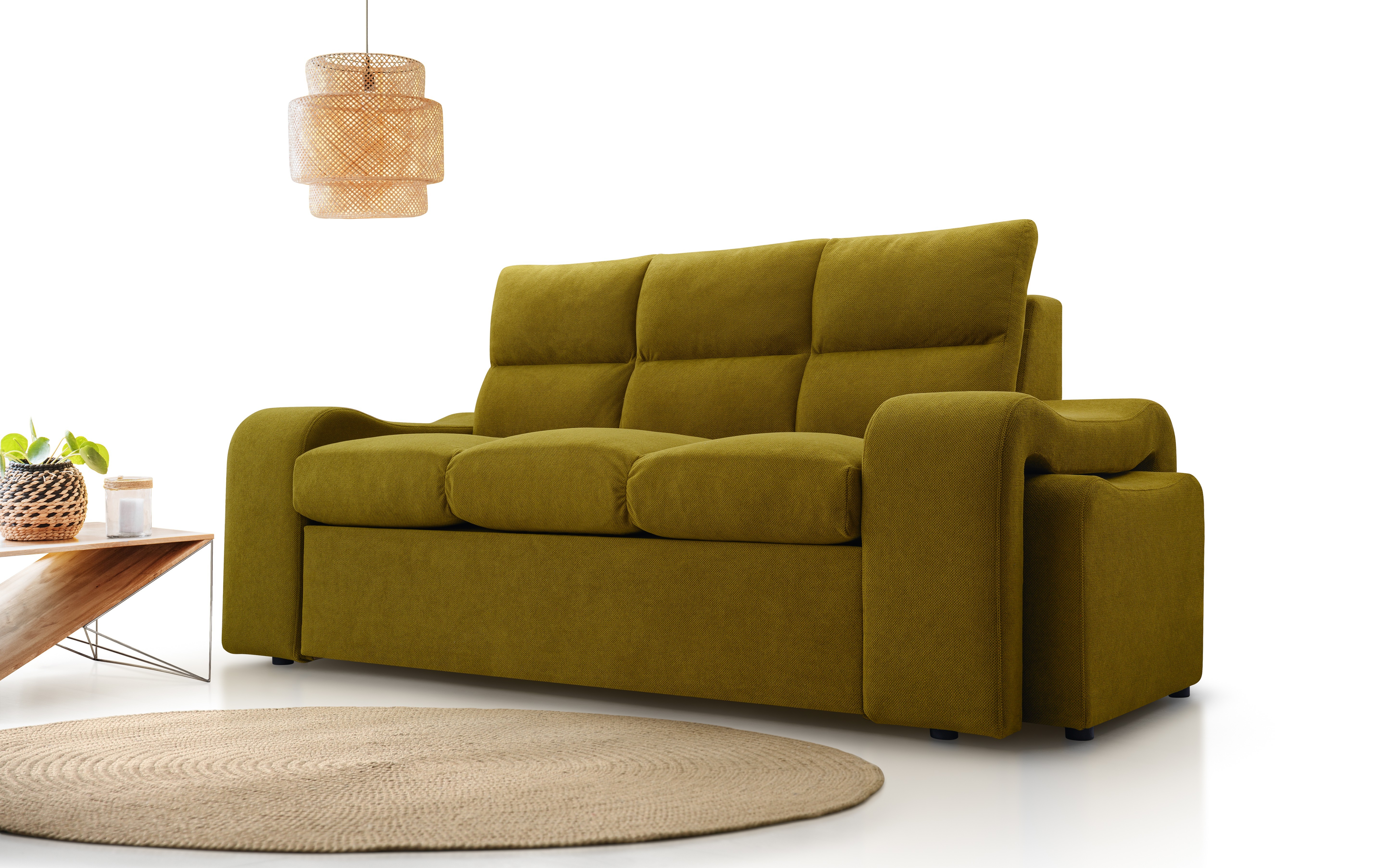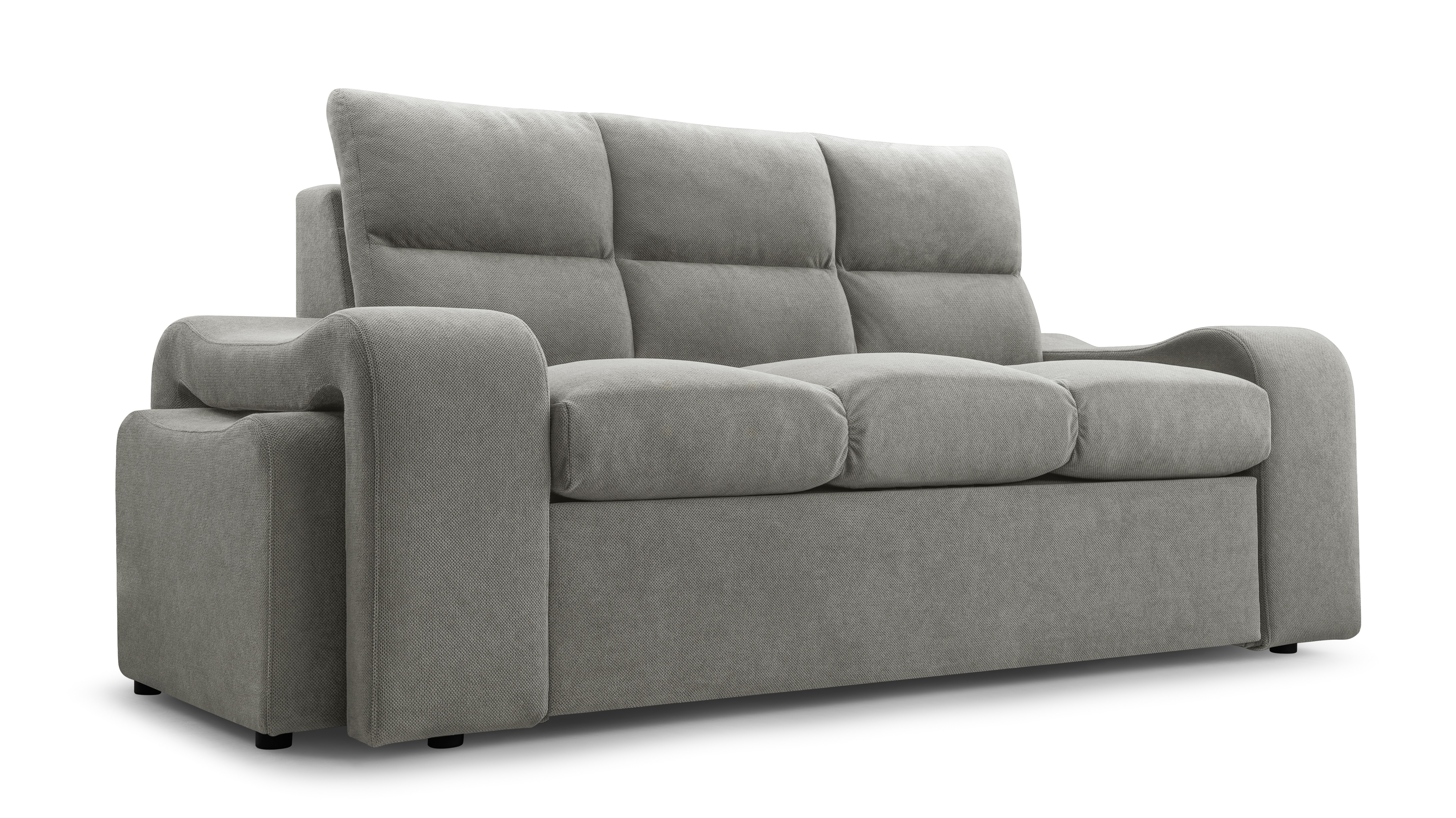 Praktická celočalouněná pohovka včetně dvou praktických taburetů, které lze lehce zasunout do stran pohovky a ušetříte tím tak spoustu prostoru. Pohovka disponuje také úložným prostorem pro úschovu kůžkovin a spací plochou, která má rozměry 148x197cm. Pohodlné sezení zaručují pružiny Faliste a kvalitní PUR pěna T35. Čalouněná je kvalitní látkou Curio 35. V nabídce naleznete i další barevné varianty.