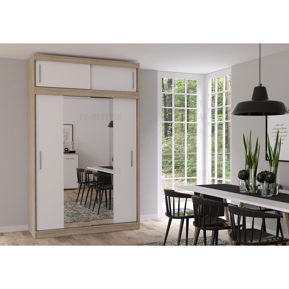 Tato šatní skříň v dekoru dub sonoma a bílá je skloubení moderního vzhledu a velmi velkého úložného prostoru. Vyrobena je z kvalitního lamina o síle 16mm. Hrany jsou lemovány kvalitní páskou ABS, která zaručuje dlouhou životnost. Nabízí vše co budete potřebovat pro dokonalou organizaci Vašeho šatníku. Naleznete zde šatní tyč a mnoho policových přihrádek. Navíc je tato skříň vybavena praktickým zrcadlem na posuvných dveřích. Tento nábytek lze zakomponovat jak do obývacíhi pokoje, ložnice ale i dětského pokoje. V nabídce ji naleznete i v jiném barevném provedení.
