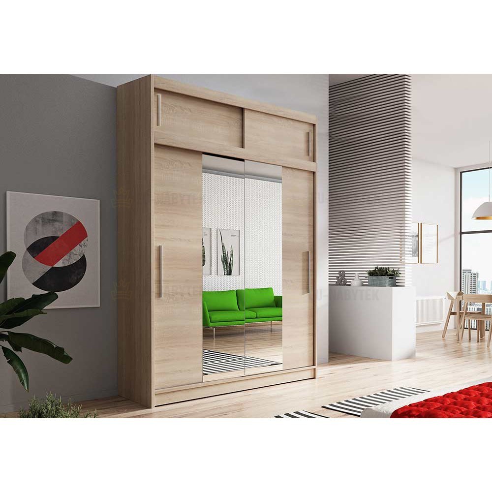 Tato šatní skříň v dekoru dub sonoma je skloubení moderního vzhledu a velmi velkého úložného prostoru. Vyrobena je z kvalitního lamina o síle 16mm. Hrany jsou lemovány kvalitní páskou ABS, která zaručuje dlouhou životnost. Nabízí vše co budete potřebovat pro dokonalou organizaci Vašeho šatníku. Naleznete zde šatní tyč a mnoho policových přihrádek. Navíc je tato skříň vybavena praktickým zrcadlem na posuvných dveřích. Tento nábytek lze zakomponovat jak do obývacíhi pokoje, ložnice ale i dětského pokoje. V nabídce ji naleznete i v jiném barevném provedení.