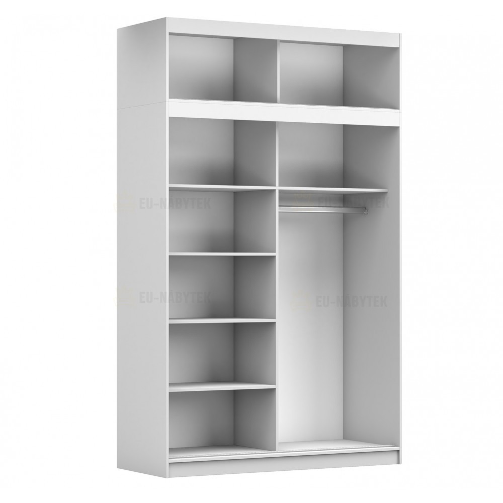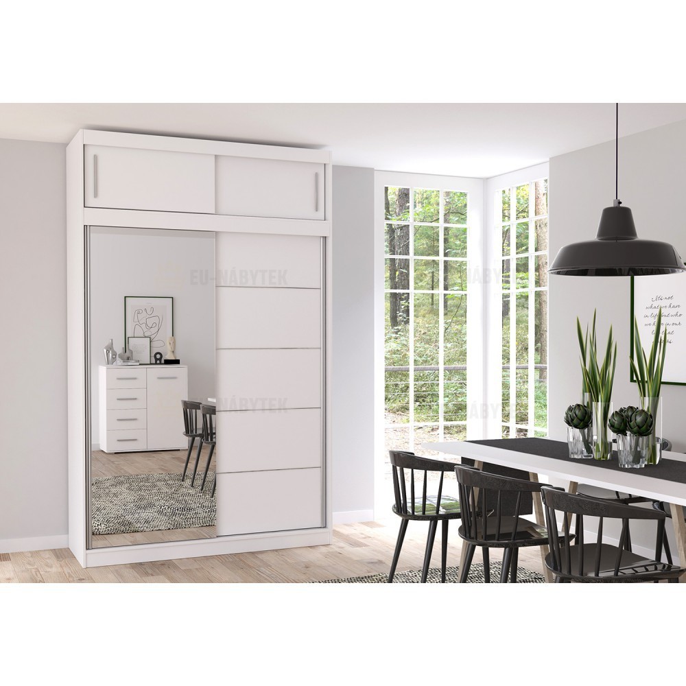 Tato šatní skříň v dekoru bílá je skloubení moderního vzhledu a velmi velkého úložného prostoru. Vyrobena je z kvalitního lamina o síle 16mm. Hrany jsou lemovány kvalitní páskou ABS, která zaručuje dlouhou životnost. Nabízí vše co budete potřebovat pro dokonalou organizaci Vašeho šatníku. Naleznete zde šatní tyč a mnoho policových přihrádek. Navíc je tato skříň vybavena praktickým zrcadlem na posuvných dveřích. Tento nábytek lze zakomponovat jak do obývacíhi pokoje, ložnice ale i dětského pokoje. V nabídce ji naleznete i v jiném barevném provedení.