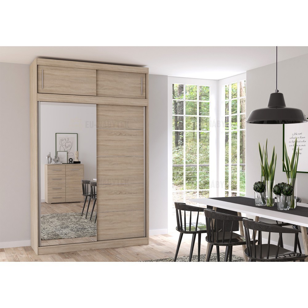 Tato šatní skříň v dekoru dub sonoma je skloubení moderního vzhledu a velmi velkého úložného prostoru. Vyrobena je z kvalitního lamina o síle 16mm. Hrany jsou lemovány kvalitní páskou ABS, která zaručuje dlouhou životnost. Nabízí vše co budete potřebovat pro dokonalou organizaci Vašeho šatníku. Naleznete zde šatní tyč a mnoho policových přihrádek. Navíc je tato skříň vybavena praktickým zrcadlem na posuvných dveřích. Tento nábytek lze zakomponovat jak do obývacíhi pokoje, ložnice ale i dětského pokoje. V nabídce ji naleznete i v jiném barevném provedení.