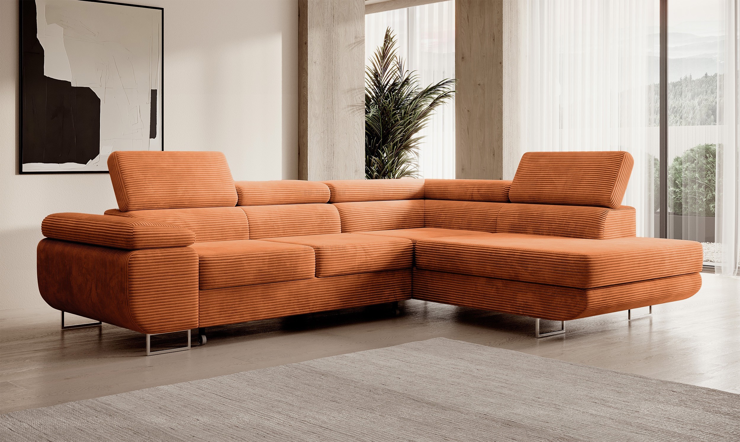 Moderní sedací souprava Stevia je ideální pro ty, kteří požadují komfort a vysoké pohodlí. Styl jejího provedení je velice nadčasový a svými liniemi zapadne do každého moderního interiéru. Na sedáky jsou použity pružiny typu Faliste. Velkou výhodou jsou polohovatelné záhlavníky, díky kterým si dopřejete ten nejlepší odpočinek. Díky čalouněným zádům lze sedací soupravu umístit i volně do prostoru. Lze si vybrat z velké škály barevných provedení, které naleznete na našich stránkách. Samozřejmostí je rozklad a úložný prostor, který se nachází v bočním otomanu.Čalouněná je kvalitní látkou Poso 40.