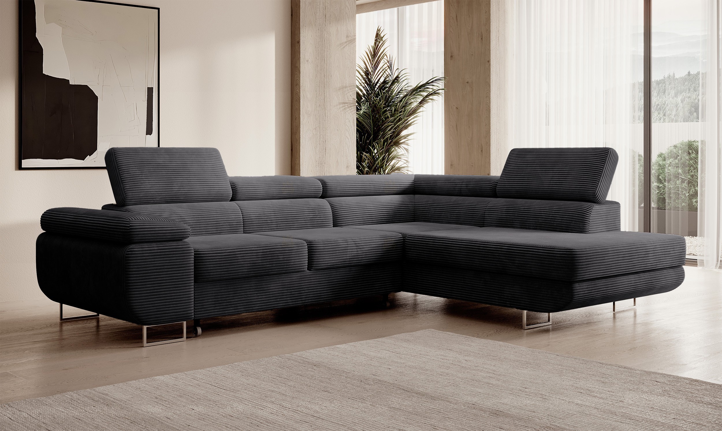 Moderní sedací souprava Stevia je ideální pro ty, kteří požadují komfort a vysoké pohodlí. Styl jejího provedení je velice nadčasový a svými liniemi zapadne do každého moderního interiéru. Na sedáky jsou použity pružiny typu Faliste. Velkou výhodou jsou polohovatelné záhlavníky, díky kterým si dopřejete ten nejlepší odpočinek. Díky čalouněným zádům lze sedací soupravu umístit i volně do prostoru. Lze si vybrat z velké škály barevných provedení, které naleznete na našich stránkách. Samozřejmostí je rozklad a úložný prostor, který se nachází v bočním otomanu.Čalouněná je kvalitní látkou Poso 34.