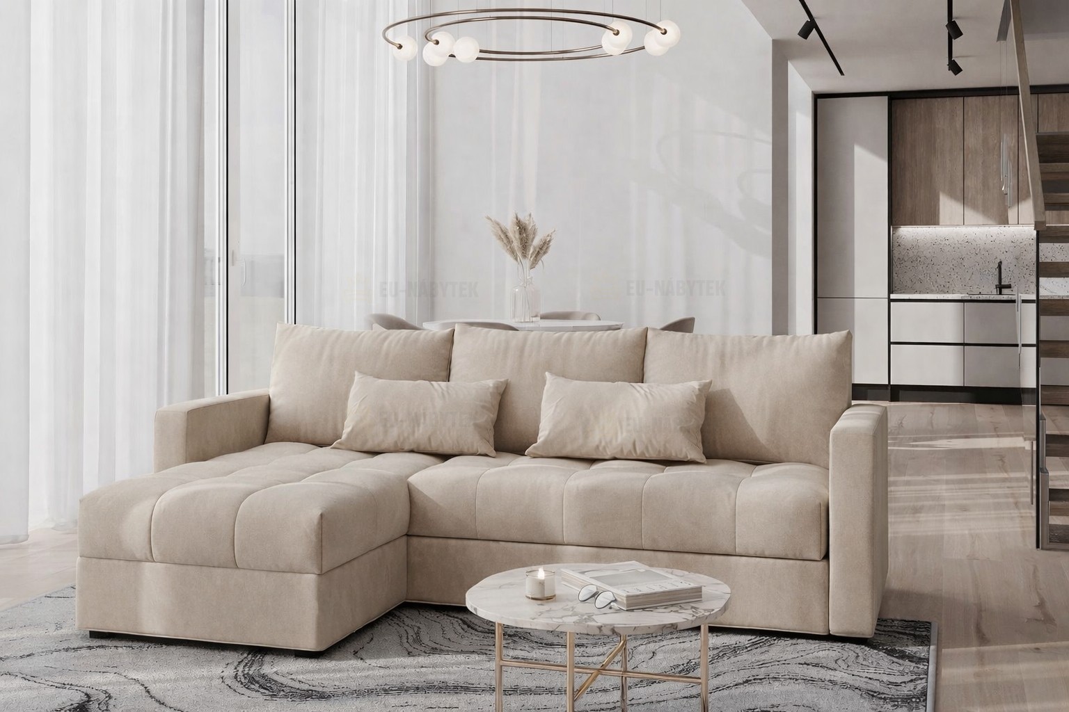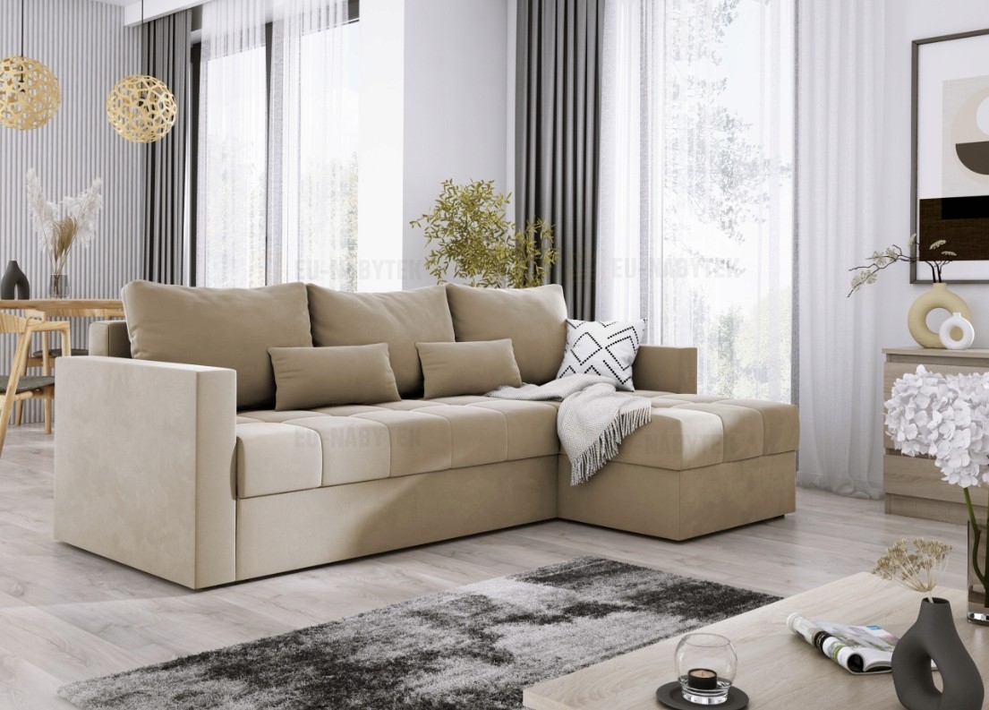 Sedací souprava Satima je i přes své jednoduché provedení velmi vkusná a bude ozdobou každého domova. Díky spoustě polštárů vám sedačka dopřejete ten nejpohodlnější odpočinek. Jedná se o sedací soupravu vhodnou do menších prostorů. Disponuje úložným prostorem a spací plochou o velikosti 205 x 125 cm. Celkové rozměry jsou 232x130x70/80 cm. Čalouněná je kvalitní látkou Kronos 34. Sedačka je univerzální, orientaci rohu si tedy zvolíte v pohodlí domova. V nabídce i v jiném barevném provedení.