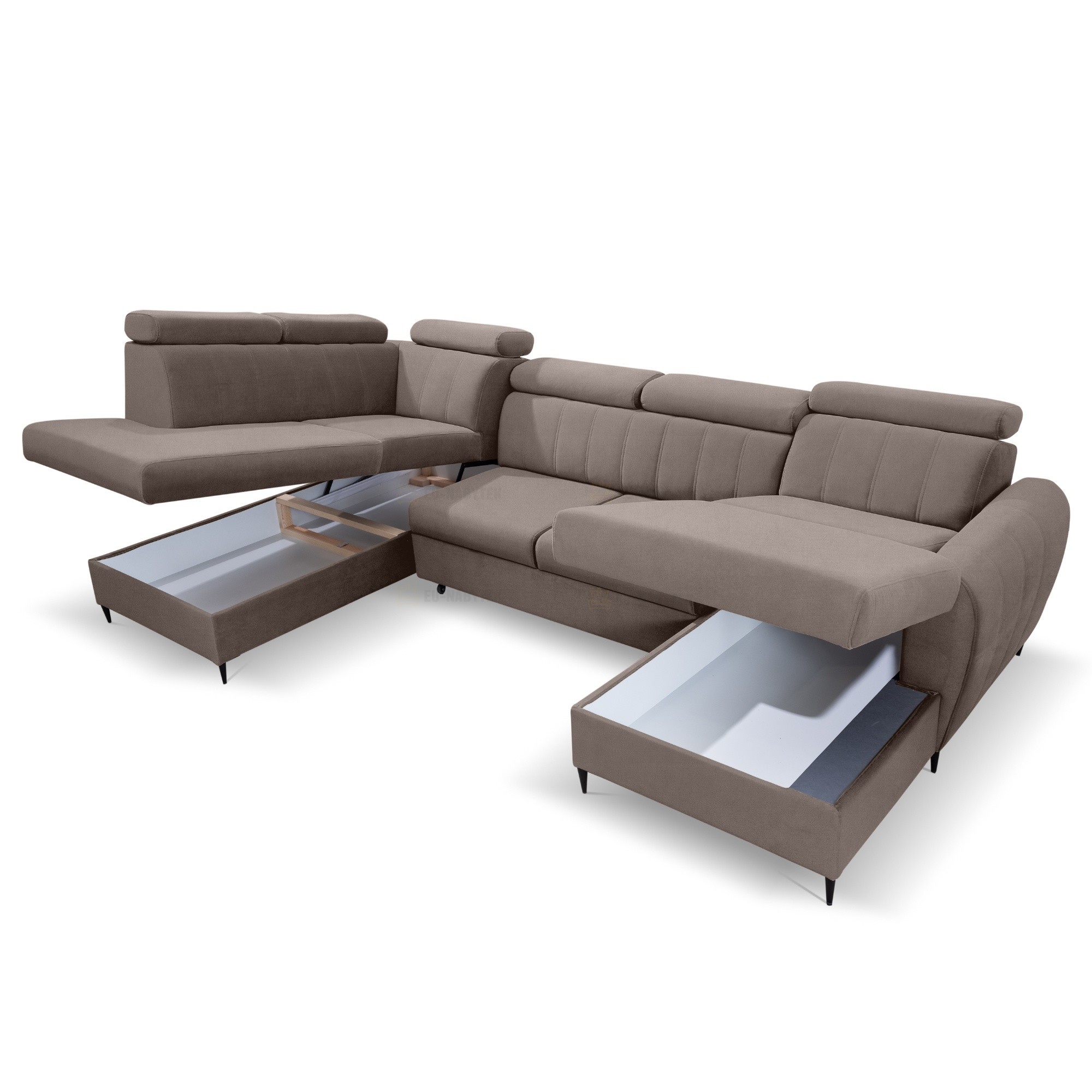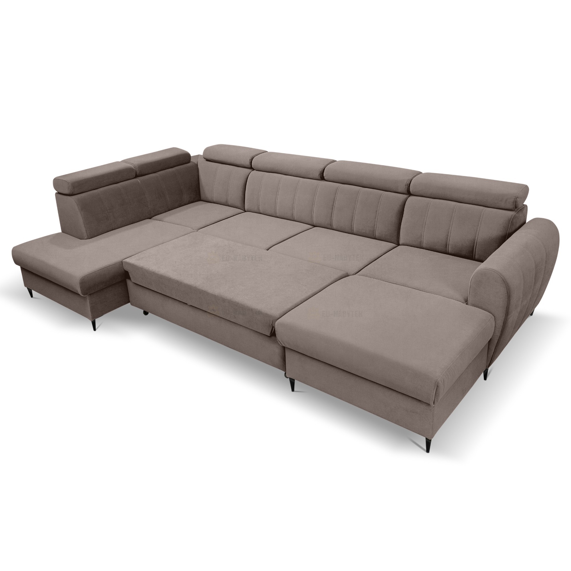 Moderní sedací souprava Forewer je ideální pro ty, kteří požadují komfort a vysoké pohodlí. Styl jejího provedení je velice nadčasový a svými liniemi zapadne do každého interiéru. Nadchne především svým zajímavým kvalitním prošíváním a designovými černými nožkami o výšce 11cm. Na sedáky jsou použity kvalitní pružiny typu Faliste spolu s vysokoelastickou PUR pěnou T30. Velkou výhodou jsou polohovatelné záhlavníky, díky kterým si dopřejete ten nejpohodlnější odpočinek. Samozřejmostí je rozklad, díky kterému získáte plochu pro příležitostné spaní o rozměru 285x130cm. Praktický úložný prostor se nachází v obou bočních otomanech. Celočalouněná - vhodná do prostoru. Čalouněná je kvalitní látkou Vogue 15. V nabídce i v jiných barevných provedeních. Na hlavním obrázku je pravý roh!