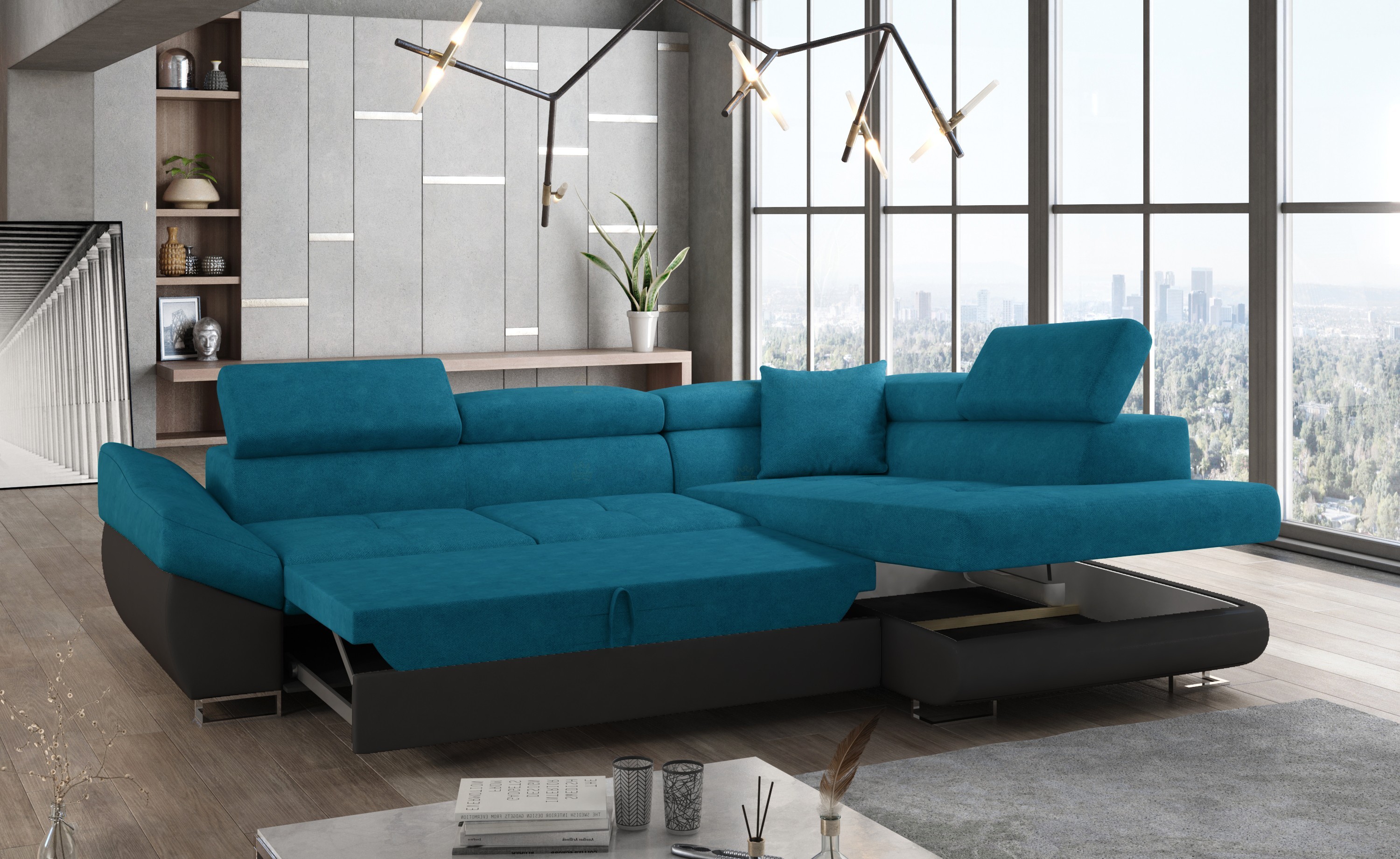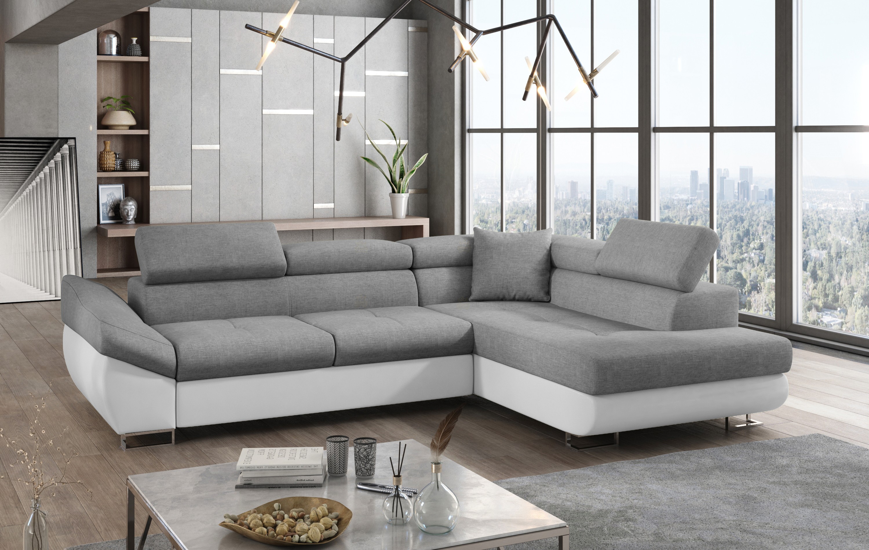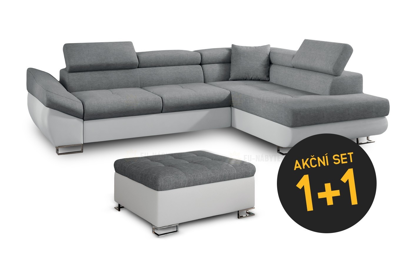 Rohová sedací souprava Lyon je ideální pro ty, kteří ocení komfort a pohodlí. Její moderní vzhled bude dominancí každého obývacího pokoje. Tkanina vysoké kvality, masivní pevná kostra, pružinové jádro s kvalitní pěnou T30 zaručují komfortní sezení. Sedací souprava je včetně úložného prostoru, který se nachází v boční části sedačky. Velkou předností této sedačky jsou tři polohovatelné záhlavníky. Jednoduchým manuálním polohováním opěrky hlavy si zvýšíte komfort sezení. Spací část nemusí být čalouněná stejnou látkou jako je sezení. Celá sedačka je detailně prošiívaná kontrastní bílou nití.Čalouněná je kvalitní látkou Sawana 05/Madryt 120.