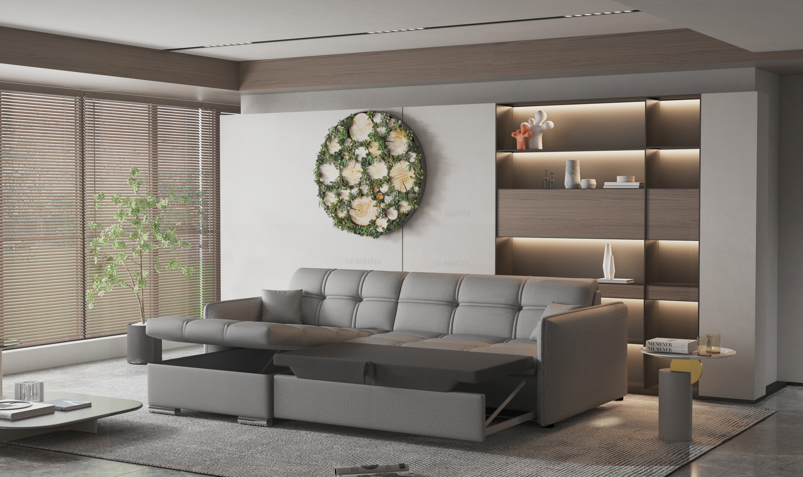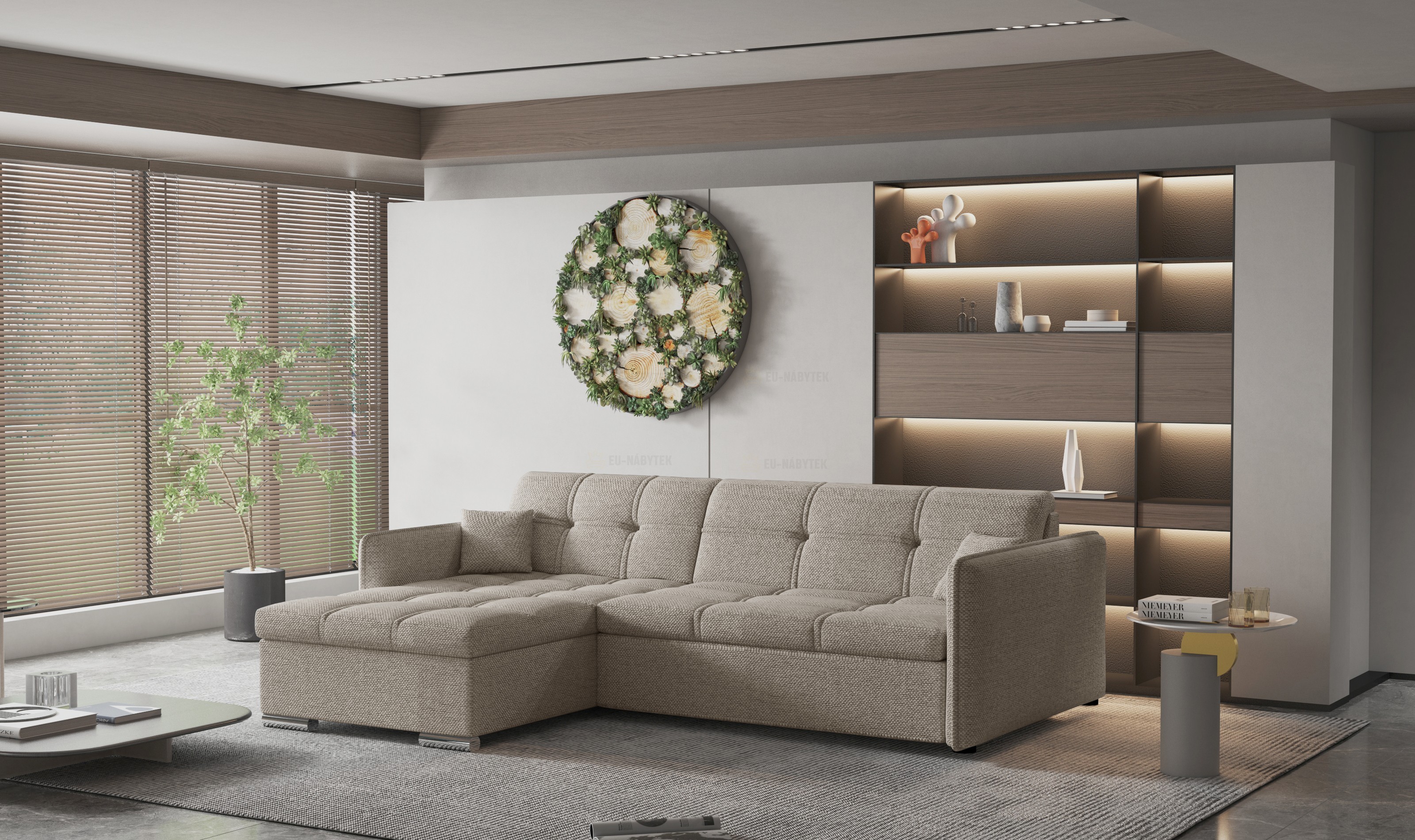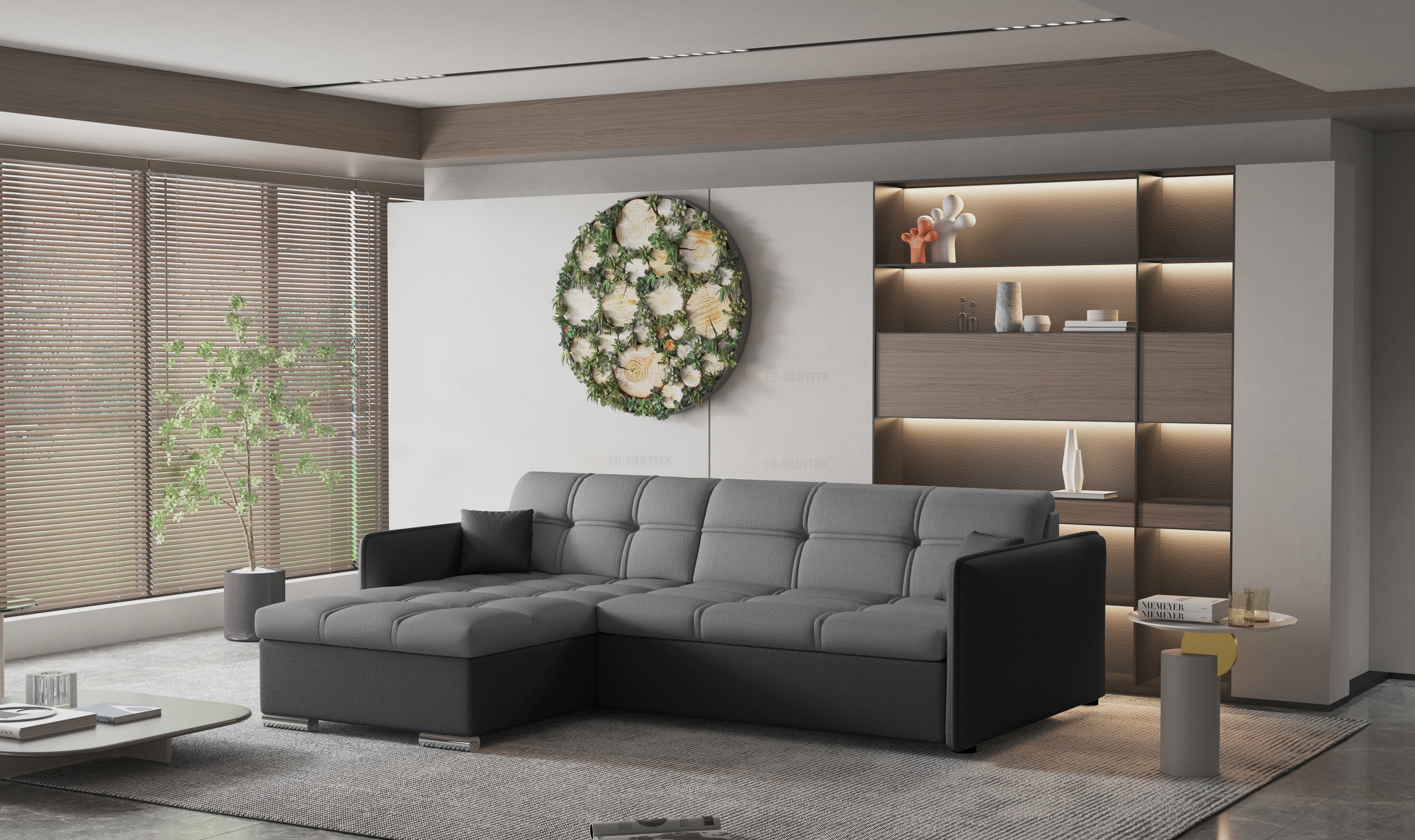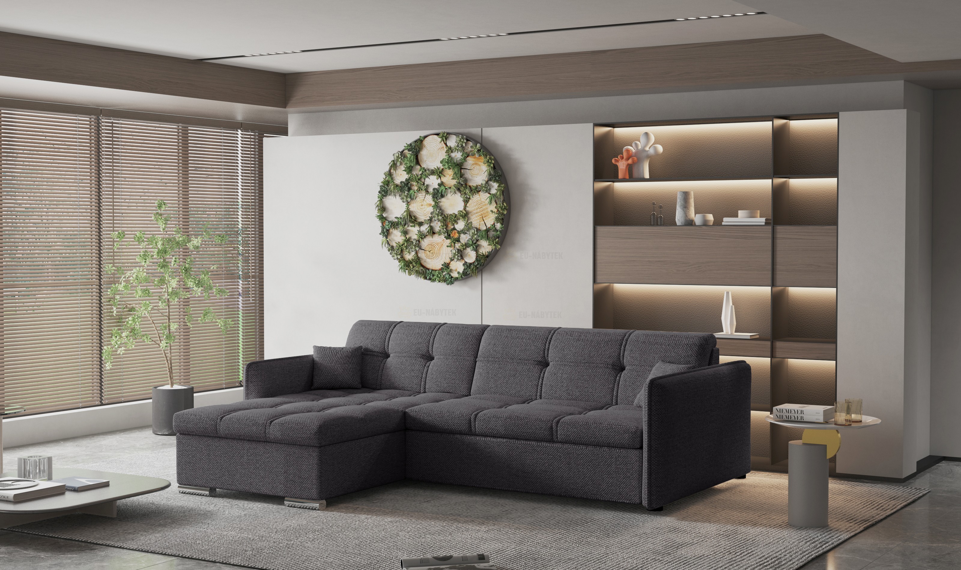 Sedací souprava LAKI je ideální pro ty, kteří ocení komfort a pohodlí. Prostorná sedačka, která se hodí do prostorných obývacích pokojů. Tkanina vysoké kvality, masivní pevná kostra, s kvalitní PUR pěnou T30 zaručují komfortní posezení. Nadchne především svým kvalitním prošitím, které sedačce dodá moderní design. Samozřejmostí je možnost rozkladu. Plocha po rozložení je o rozměru 134x227cm. Sedací souprava také disponuje úložným prostorem, který se nachází v bočním otomanu. Moderní designové úzké područky, díky kterým tak získáte větší prostor pro sezení. Designové nožky jsou z kovu, délka je 10cm. Barevné provedení - Orinoco 95/96. V nabídce ji naleznete i v jiném barevném provedení.