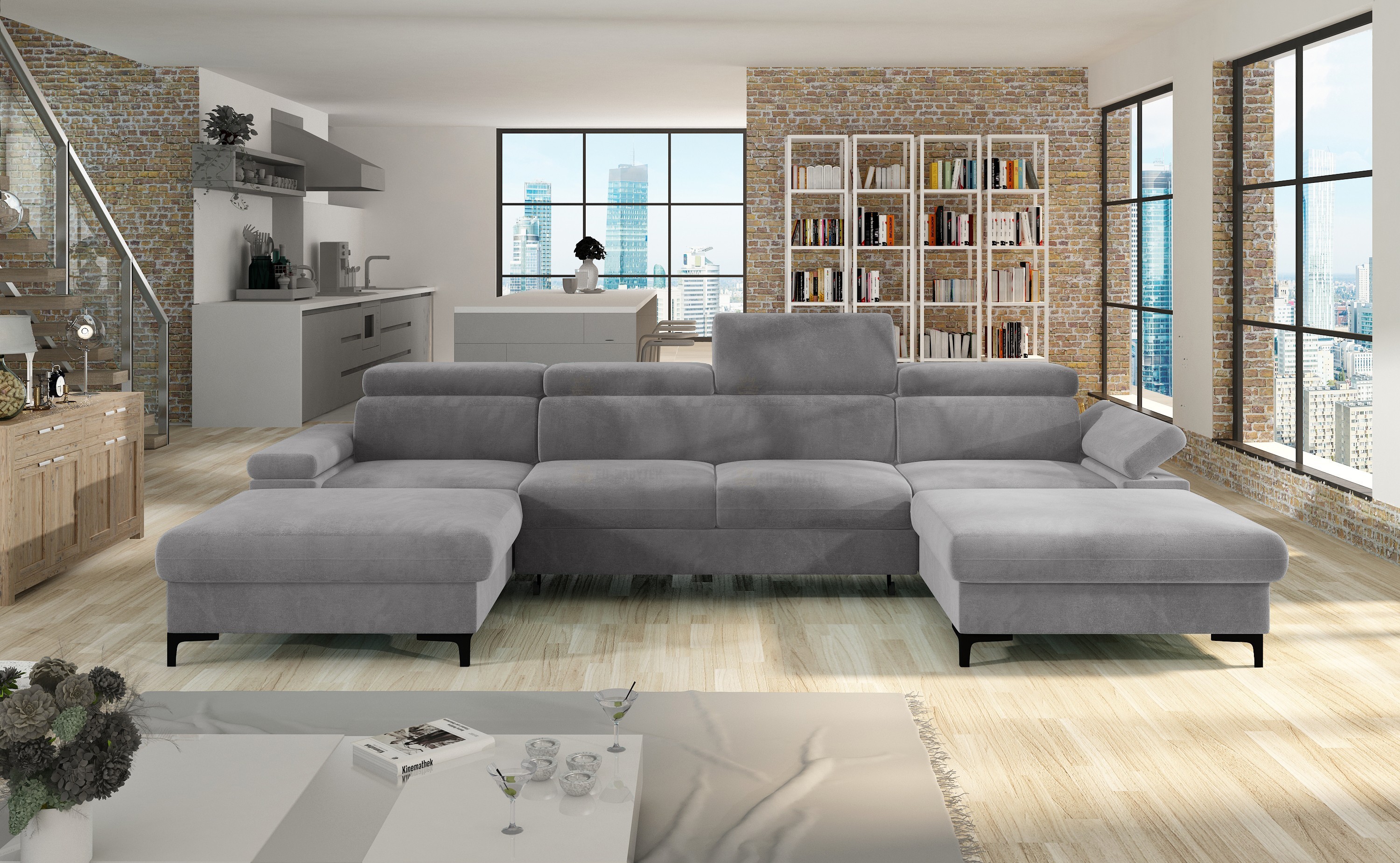 Moderní sedací souprava APOLENA je ideální pro ty, kteří požadují komfort a vysoké pohodlí. Styl jejího provedení je velice nadčasový a svými liniemi zapadne do každého moderního interiéru. Na sedáky jsou použity kvalitní pružiny typu Faliste spolu s vysokoelastickou PUR pěnou. Velkou výhodou jsou čtyři polohovatelné záhlavníky s 6-ti stupňovou regulací a područky. Samozřejmostí je rozklad, díky kterému získáte praktickou plochu pro příležitostné přespání. Praktický úložný prostor se nachází v bočních otomanech. Designovým prvkem jsou černé kovové nožky, které dodávají sedačce luxusní vzhled. Čalouněná je kvalitní látkou Whisper 19. V nabídce ji naleznete i v jiných barevných provedeních.