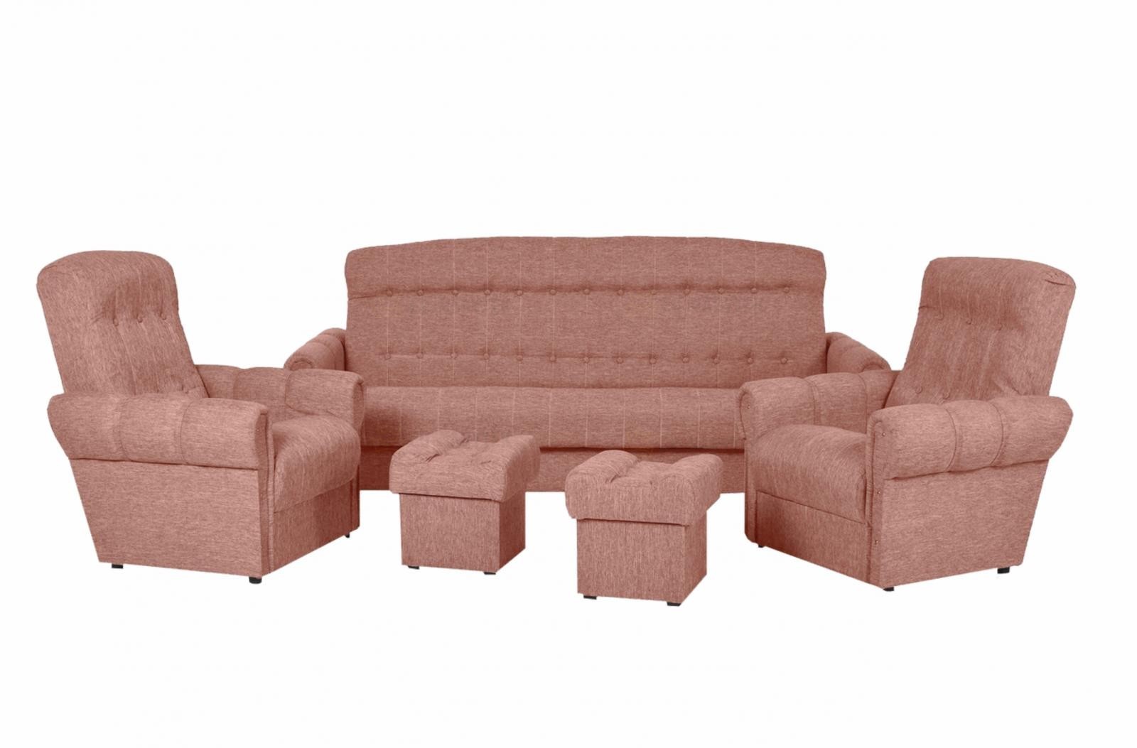 Pohodlná a prostorově nenáročná sedací souprava Arnold, která garantuje vysokou kvalitu provedení a dlouhou životnost. Sedací souprava má jednoduchý systém rozkládání včetně úložného prostoru. Pohodlné sezení zaručuje vysokoelastická PUR pěna T30. Souprava se skládá ze dvou křesel (77x70x94cm), dvou taburetů (36x36x36cm) a pohovky (213x85x86cm), která po rozložení disponuje spací plochou 117x184cm. Sestava je čalouněná látkou Malmo 63. V nabídce i v jiném barevném provedení.
