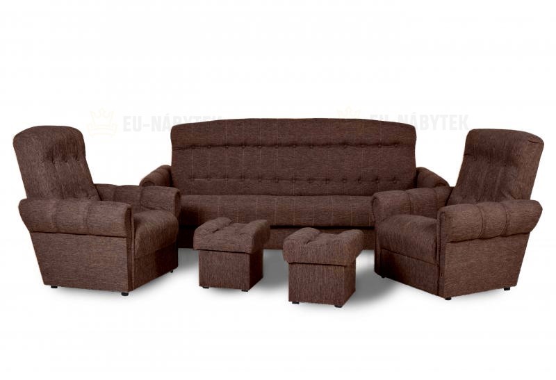 Pohodlná a prostorově nenáročná sedací souprava Arnold, která garantuje vysokou kvalitu provedení a dlouhou životnost. Sedací souprava má jednoduchý systém rozkládání včetně úložného prostoru. Pohodlné sezení zaručuje vysokoelastická PUR pěna T30. Souprava se skládá ze dvou křesel (77x70x94cm), dvou taburetů (36x36x36cm) a pohovky (213x85x86cm), která po rozložení disponuje spací plochou 117x184cm. Sestava je čalouněná látkou Malmo 26. V nabídce i v jiném barevném provedení.