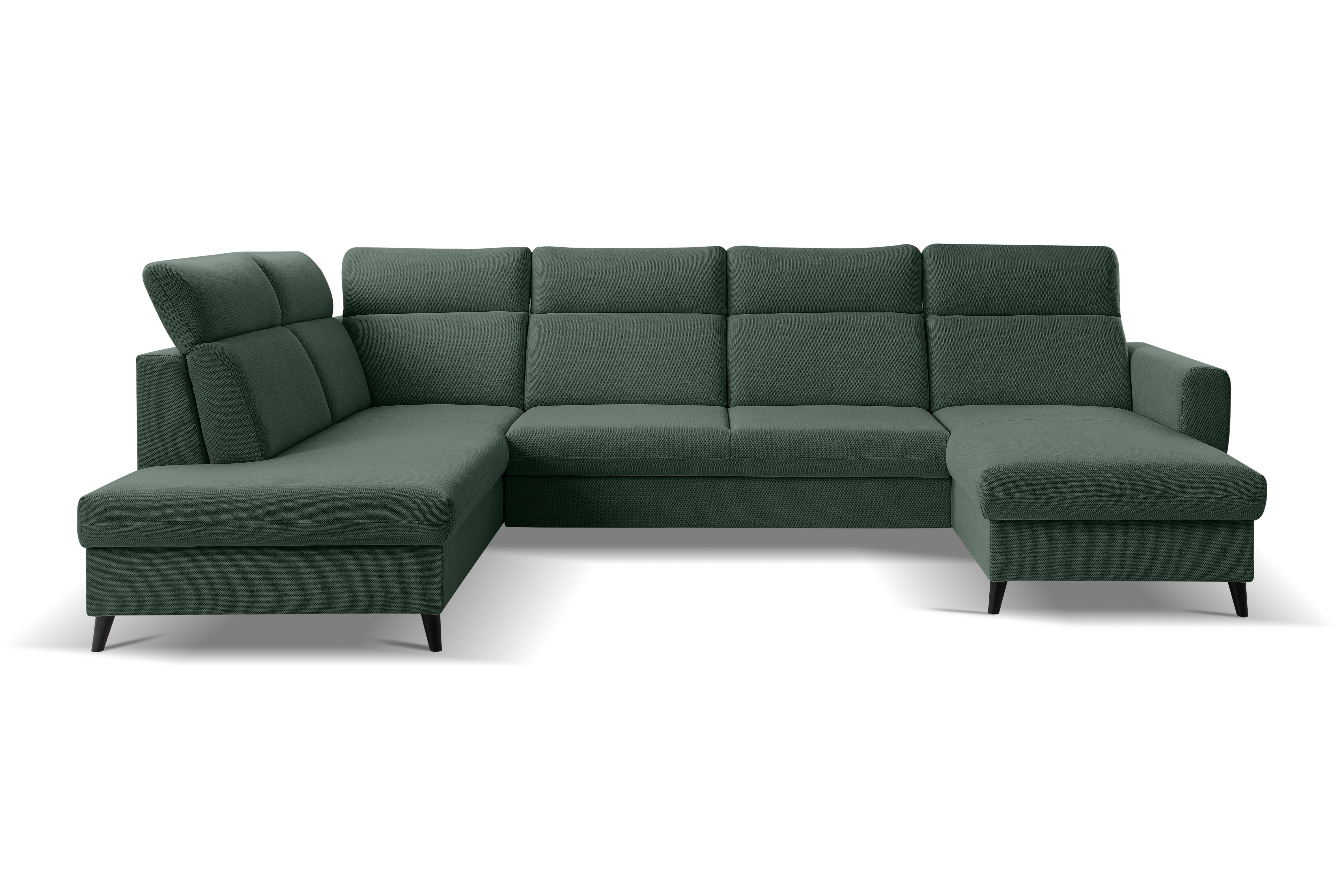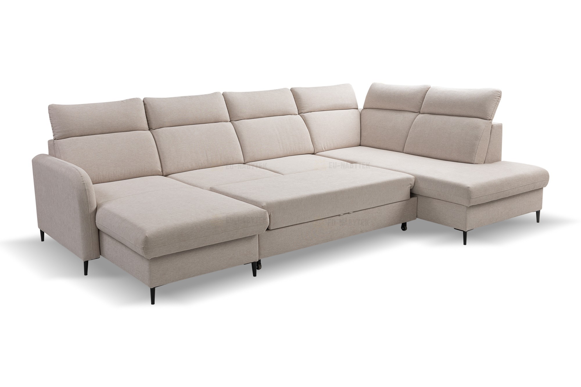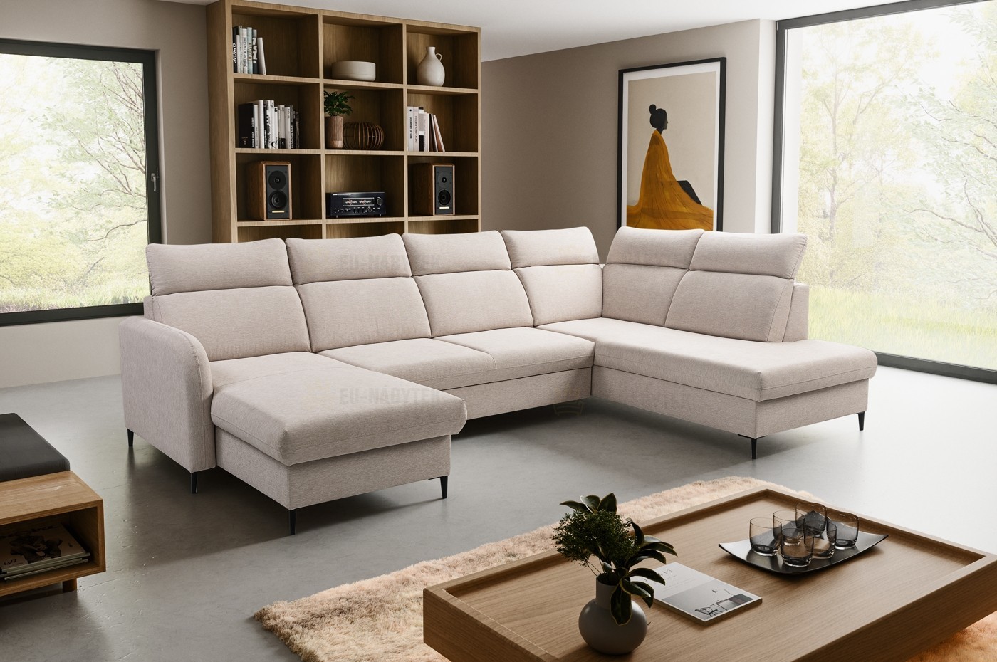 Moderní sedací souprava Torrino je ideální pro ty, kteří požadují komfort a vysoké pohodlí. Styl jejího provedení je velice nadčasový a svými liniemi zapadne do každého interiéru. Nadchne především svými designovými černými kovovými nožkami, které dodávají sedačce luxusní vzhled. Na sedáky jsou použity kvalitní pružiny typu Faliste spolu s vysokoelastickou PUR pěnou T30. Velkou výhodou jsou polohovatelné záhlavníky, díky kterým si dopřejete ten nejpohodlnější odpočinek. Samozřejmostí je rozklad, díky kterému získáte plochu pro příležitostné spaní o rozměru 285x125cm. Praktické úložné prostory se nachází v bočních otomanech. Celkové rozměry sedačky jsou 340x202/175x105cm. Celočalouněná - vhodná do prostoru. Čalouněná je kvalitní látkou Vogue 01. Na hlavním obrázku je levý roh!