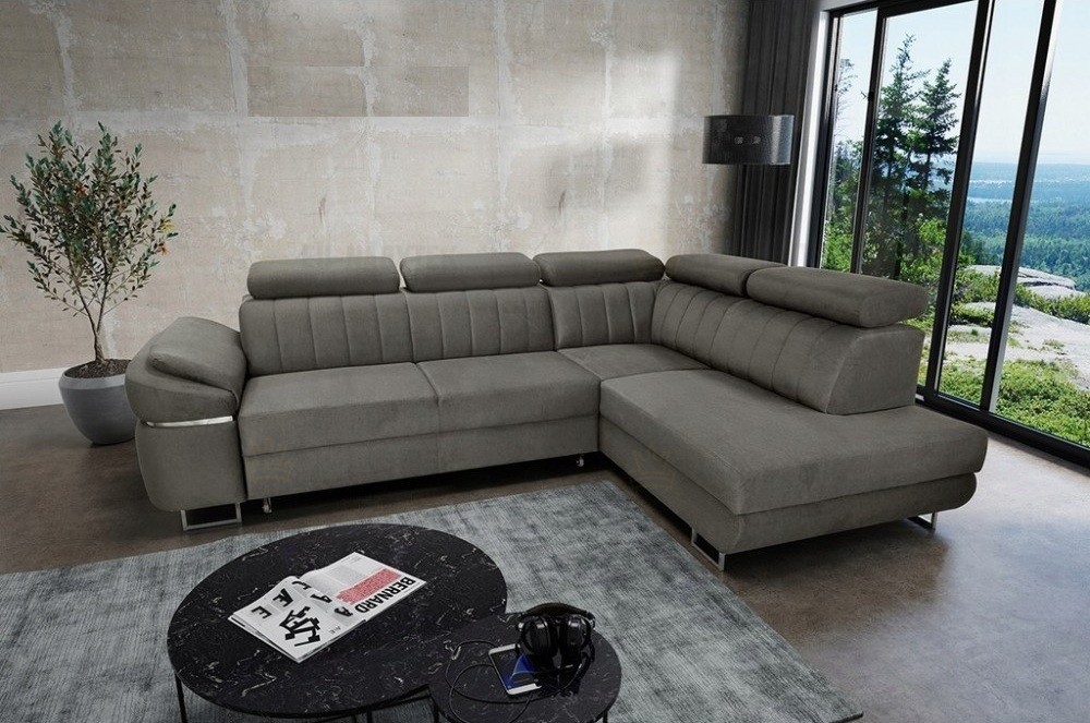 Moderní sedací souprava Akron je ideální pro ty, kteří požadují komfort a vysoké pohodlí. Stav jejího provedení je velice moderní a svými liniemi zapadne do každého interiéru. Nadchne především svým propracovaným prošitím zad, které dodá sedačce nadčasový design. Vzhledem k očalouněným zádům je vhodná do prostoru. Na sedáky jsou použity pružiny typu Faliste a vysokoelastická PUR pěna. Samozřejmostí je automatický úložný prostor v bočním otomanu a rozklad pro příležitostné spaní o rozměru 128x200cm. Moderním prvkem jsou velmi zajímavé područky s dekoračním střbrným páskem. Velkou výhodou jsou polohovatelné záhlavníky, díky kterým si dopřejete pohodlný odpočinek. Čalouněná je kvalitní Castel 15. Lze si vybrat z velké škály barevných provedení, které naleznete na našich stránkách.