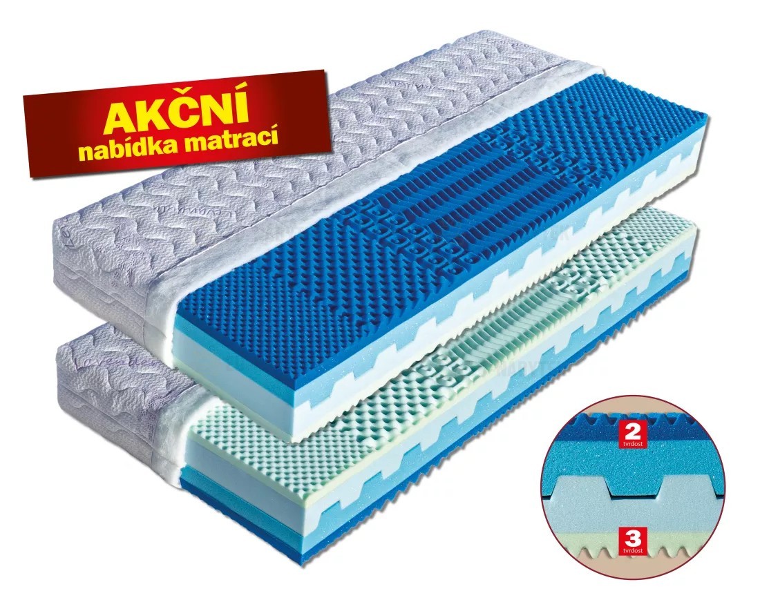 Vrchní modrá vrstva je tvořena viscoelastickou pěnou (50 kg/m³). Tato pěna Vám zajistí optimální rozložení váhy těla na matraci. Provzdušněné jádro s příčnými průduchy je složené z vrstvy extra prodyšné studené HR pěny (40 kg/m³) s dokonalou elasticitou a z tvrzené elastické pěny MediFoam (35 kg/m³). Druhou vrchní vrstvu tvarovanou do masážních nopů tvoří pěna MediFoam (32 kg/m³). Je vhodná pro všechny typy roštů. Celková výška matrace cca 23 cm.