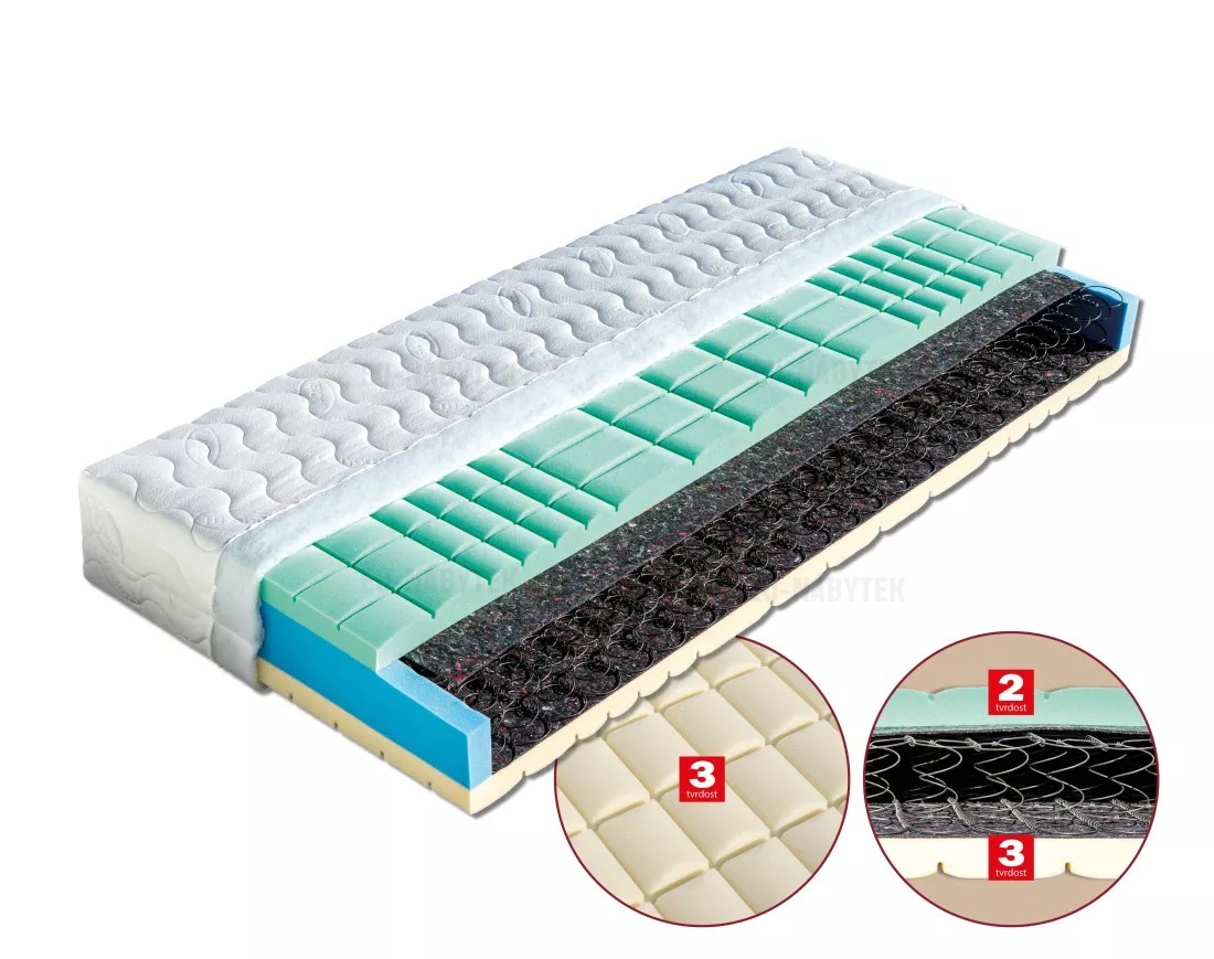 Velmi kvalitní pružinová matrace vrstvená elastickými pěnami MediFoam různých objemových hmotností (35 a 40 kg/m³) rozdělených do 7 anatomických zón s antidekubitním průřezem. Výška jádra poskytuje uživateli komfort, pevnou anatomickou oporu páteře a zároveň zajišťuje vysokou vzdušnost matrace. Pružinové matrace je možné uložit na pevnou desku, ale i na pevný lamelový rošt. Celková výška matrace cca 24 cm.