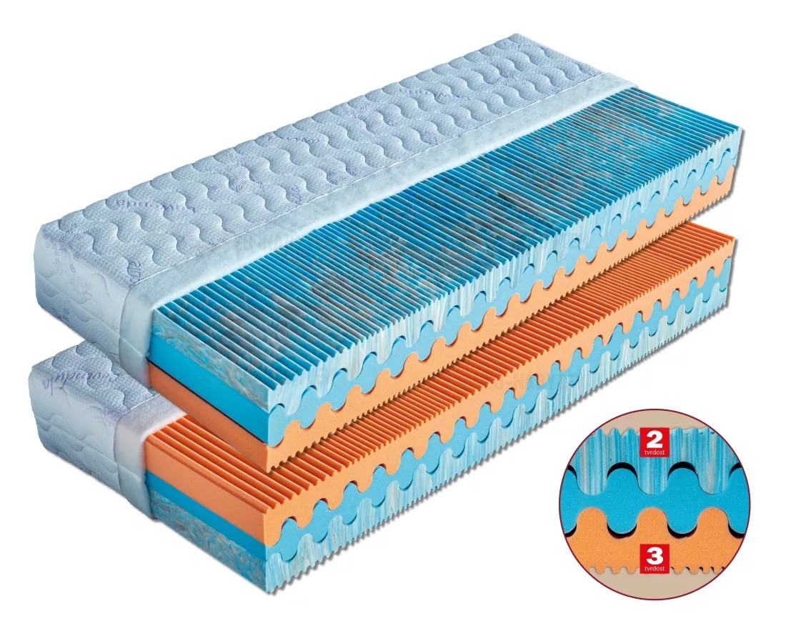 Partnerská matrace dvojí tvrdosti z velmi kvalitních studených pěn, které se vyznačují dlouhou životností. Pouhým otočením matrace zvolíte její tvrdost. Vrchní strana, s tvrdostí č. 2, je tvořena značkovou studenou pěnou PanterFoam Nautic (50 kg/m³), která přináší to nejlepší pro Váš spánek. Její vysoká hustota zabezpečí nadstandardní odolnost. Díky speciální technologii výroby jsou její buňky otevřené, a proto velmi vzdušné. Navíc má speciální antibakteriální úpravu, díky které je odolná proti bakteriím a roztočům. Pevné jádro z MediFoam pěny (35 kg/m³) je tvarováno do souměrných vlnek, aby se mohlo přizpůsobit ležícímu tělu. Tvrdší stranu matrace (tvrdost č. 3) tvoří studená pěna (45 kg/m³), která je pro větší provzdušnění a pohodlí profilovaná do vlnek.