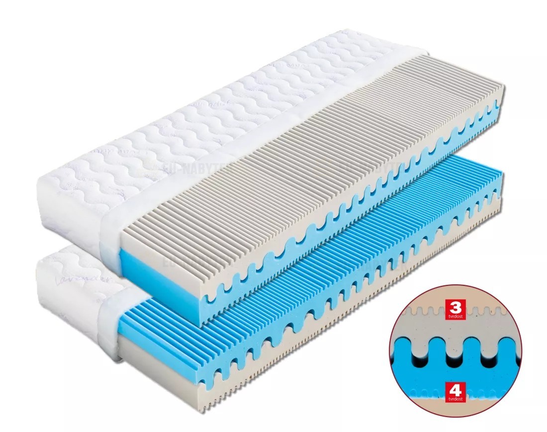 Pevná ortopedická matrace s volbou dvojí tvrdosti, která Vás nadchne špičkovou kvalitou vysoce gramážních pěn. Její provzdušněný střed se díky různě širokým vlnkám (zónám) výborně přizpůsobí ležícímu tělu. Měkčí stranu tvoří luxusní pěna značky Cellflex (40 kg/m³), která je díky svým otevřeným buňkám prodyšná a zajistí vynikající rozložení tlaku na matraci. Díky vysoké hustotě je velmi odolná a příjemná. Pevnější strana je tvořena tvrzenou modrou pěnou MediFoam (35 kg/m³). Obě pěny jsou na povrchu příčně profilované do vlnek pro větší vzdušnost a lepší rozložení váhy. Profil umožňuje spojení materiálů bez použití lepidla. Matrace je vhodná pro všechny typy roštů. Celková výška matrace cca 22 cm.