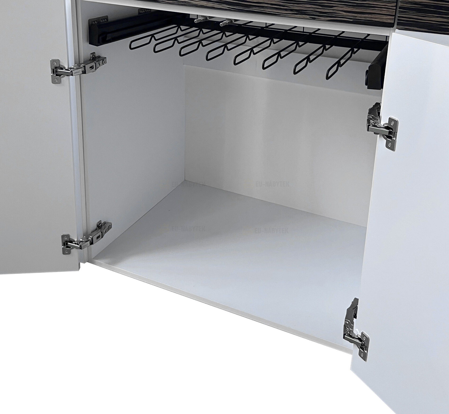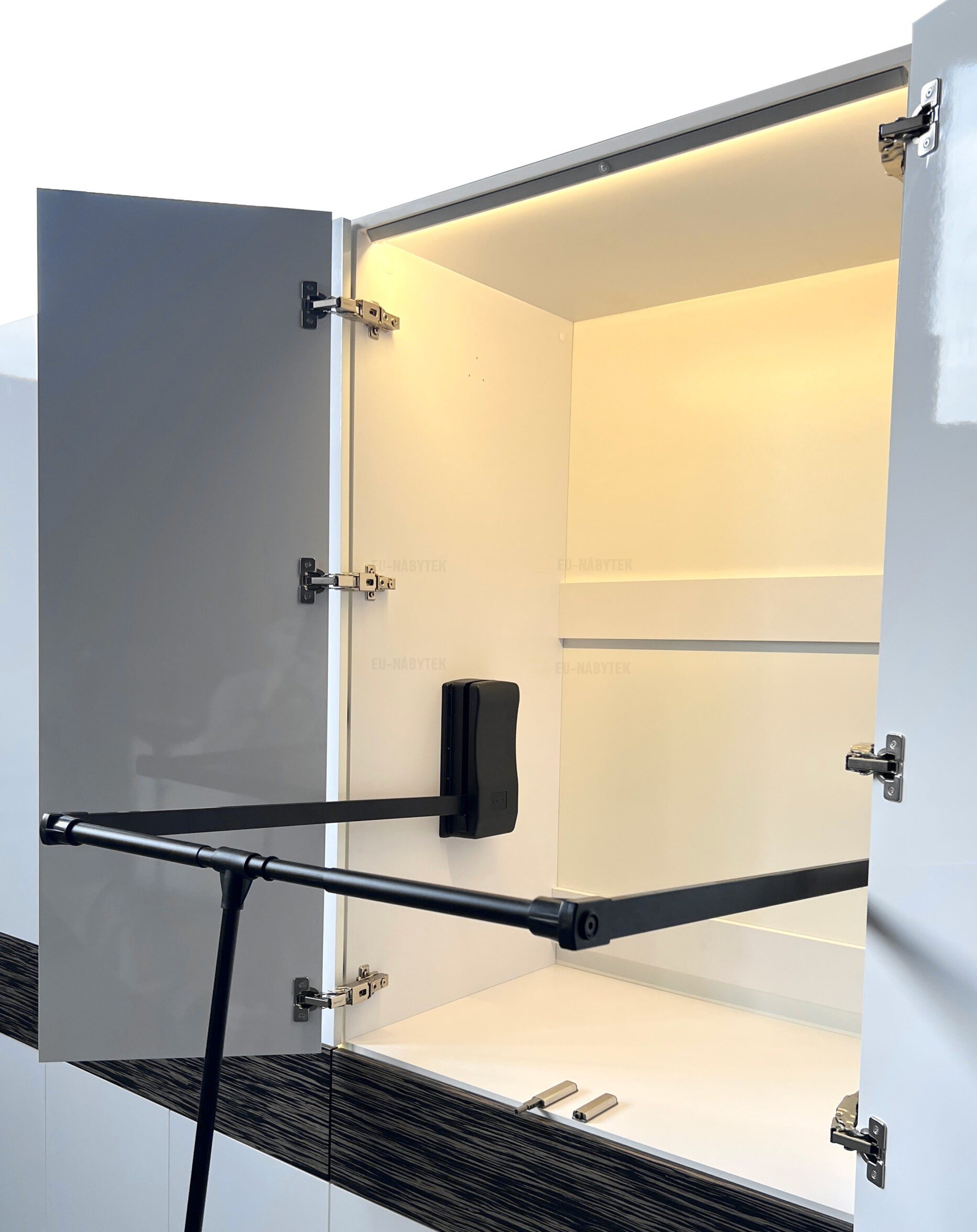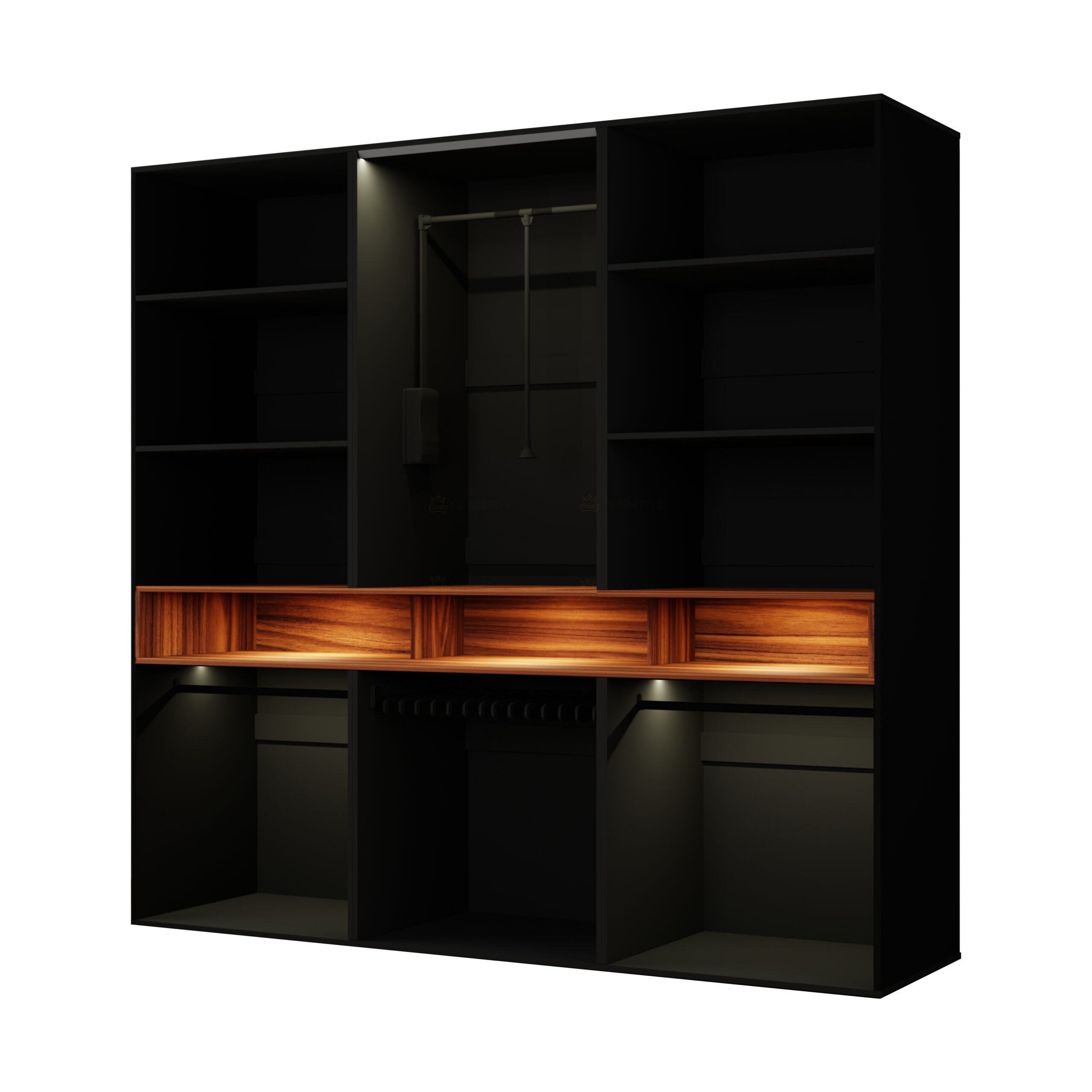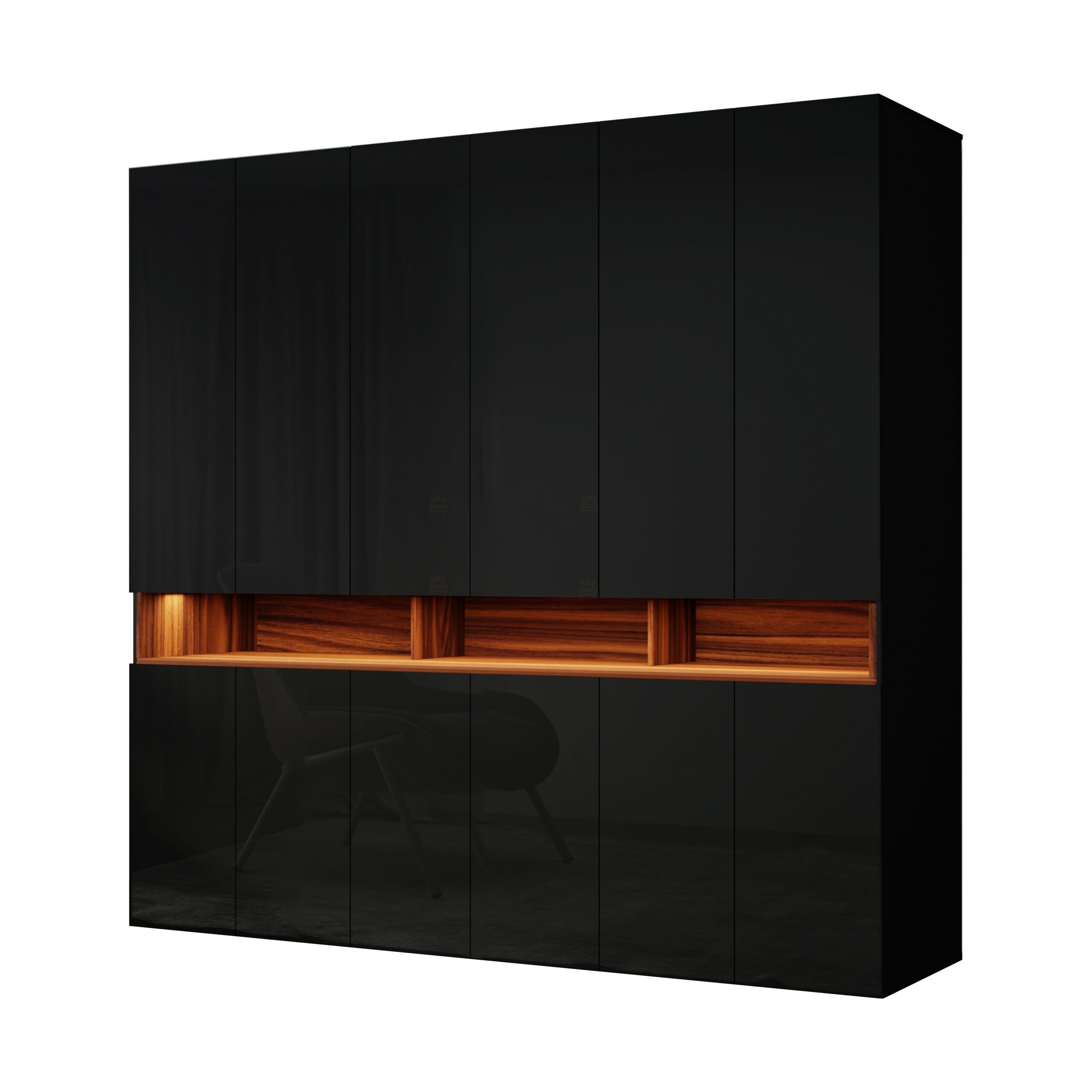 Moderní šatní skříň, která zaujme svým elegantním designem a praktickým uspořádáním. Moderní a minimalistický vzhled. Vysoký lesk v černé barvě působí luxusně a opticky zvětšuje prostor, zatímco dekor přírodního dřeva v otevřených policích dodává celku teplý a příjemný kontrast. Rozměry skříně jsou 240x240x60cm. Materiál je laminovaná MDF s povrchovou úpravou ve vysokém lesku, korpus je matný. Kombinace uzavřených skříní a otevřených polic na dekorace. Skříň Laurino je ideálním řešením pro moderní ložnice či šatny. Je nejen designovým kouskem, ale také praktickým pomocníkem pro každodenní organizaci vašeho oblečení a doplňků. Součástí skříně je také LED osvětlení, které podtrhuje estetiku. Pro maximální komfort je vybavena i praktickým pantografem – výsuvným ramenem, které umožňuje snadné dosažení zavěšeného oblečení i ve vyšších partiích skříně. V nabídce i v jiném barevném provedení.