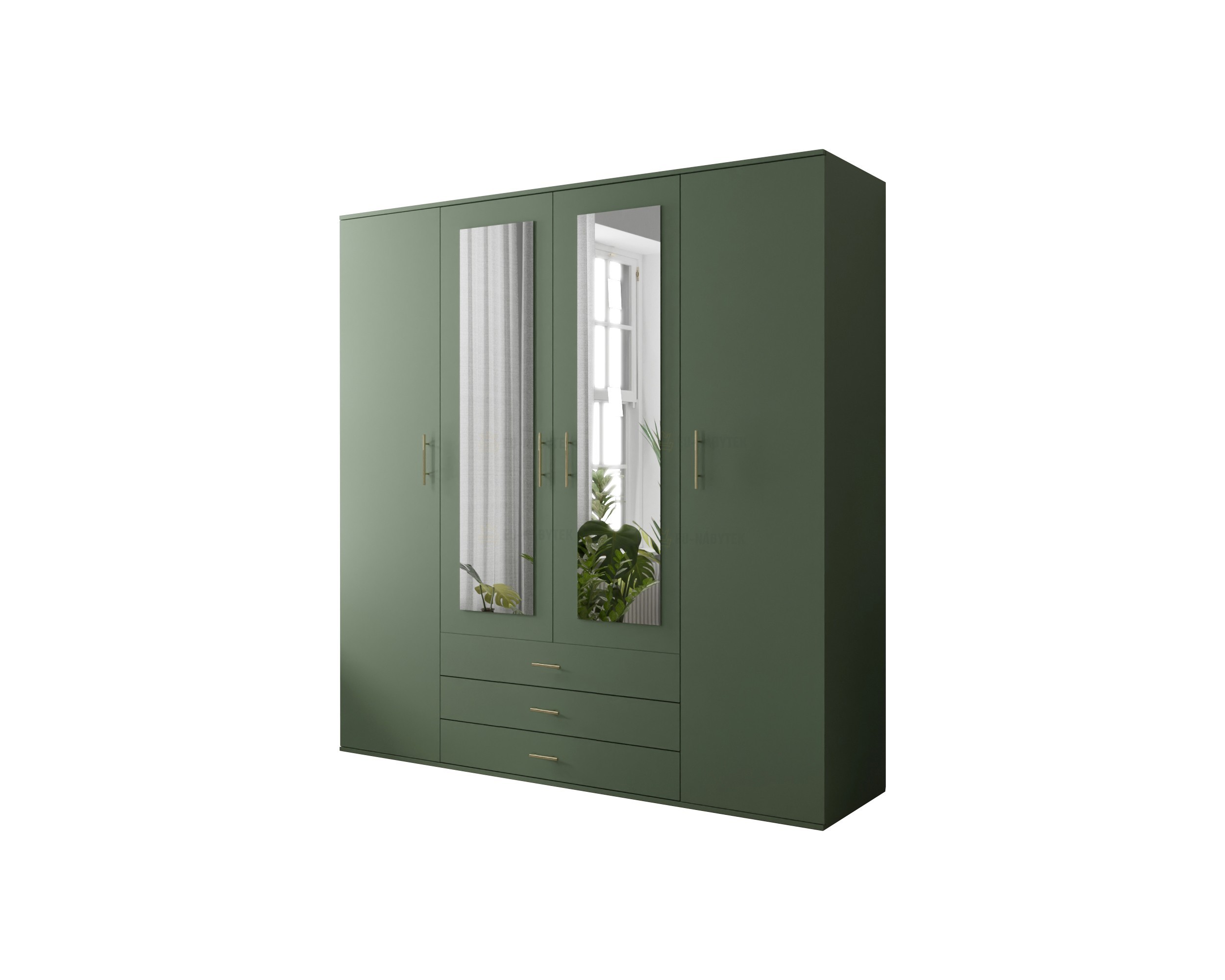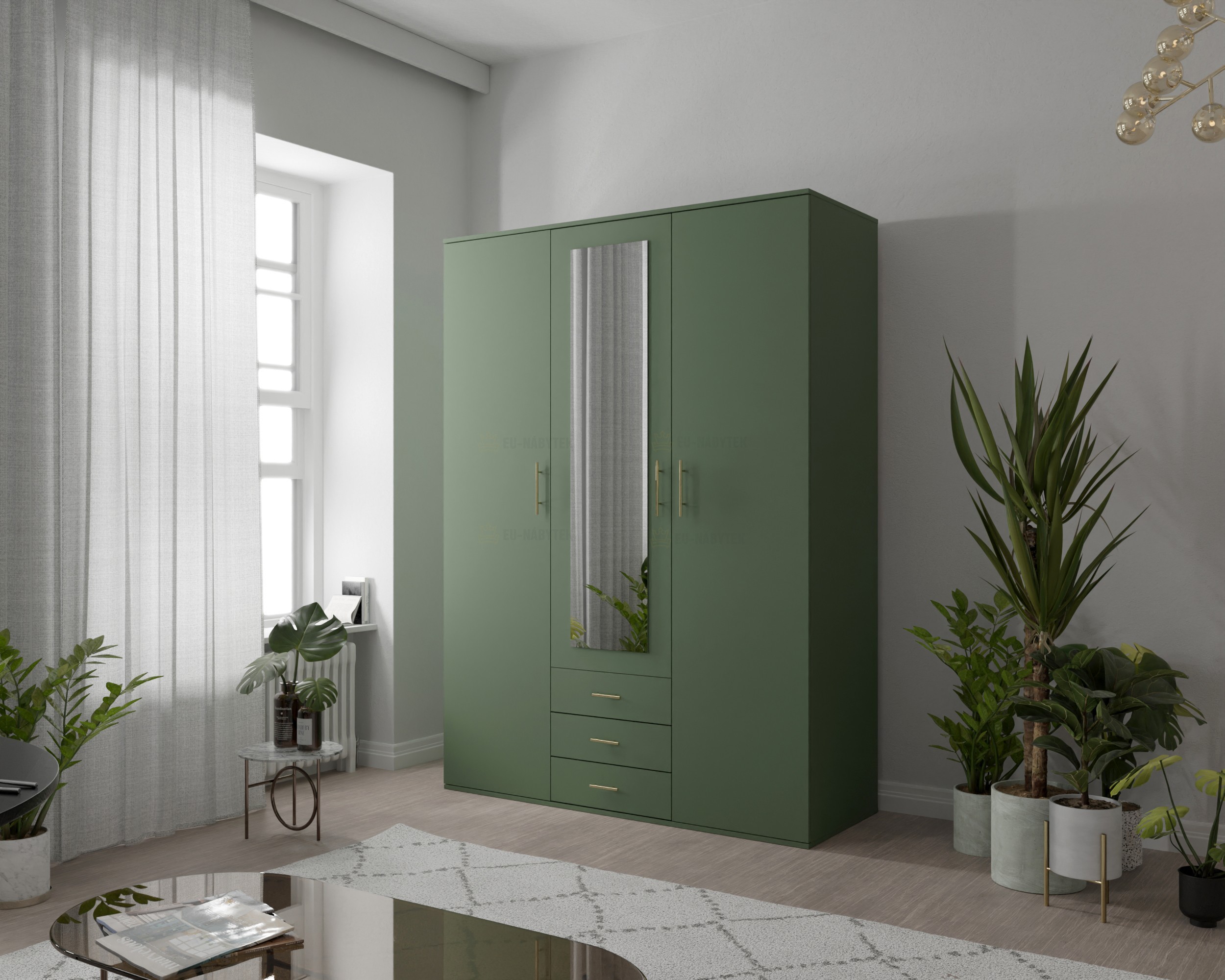 Praktická a stylová šatní skříň Olivio 150 je ideální volbou do moderních interiérů. Elegantní zelené provedení doplňuje zrcadlový panel na středních dveřích, který opticky zvětšuje prostor a zároveň plní praktickou funkci při každodenním oblékání. Uvnitř skříně naleznete promyšlené rozvržení úložného prostoru – police, šatní tyč a tři zásuvky umožňují přehledné uložení oblečení, doplňků i obuvi. Skříň je perfektní volbou do ložnic, předsíní i studentských pokojů. Kombinuje moderní design s maximální funkčností. Celkové rozměry jsou 200x210x58cm. V nabídce ji naleznete i v šíři 150cm.