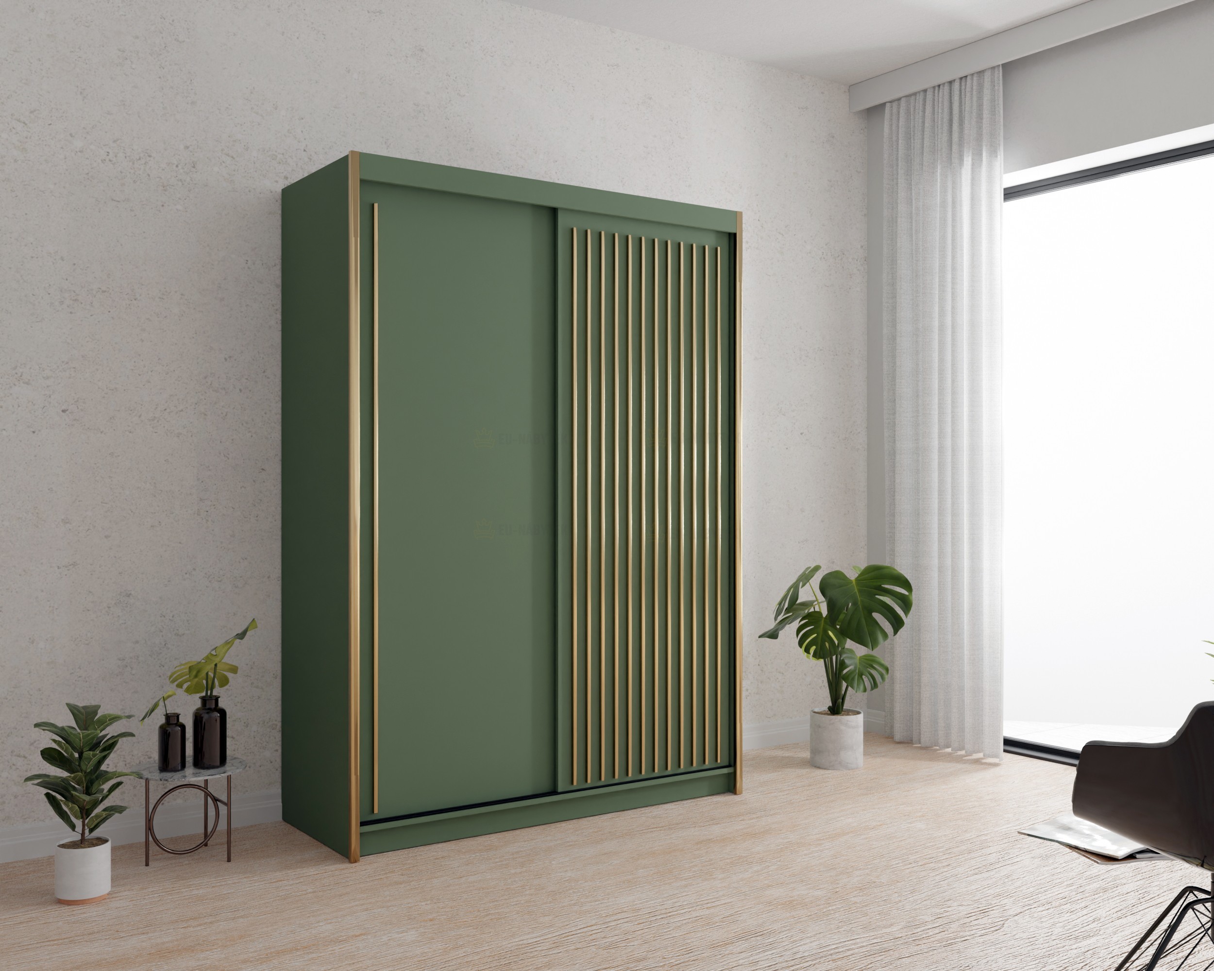 Stylová šatní skříň Pedro o šířce 250 cm zaujme na první pohled svým moderním designem v elegantním zeleném provedení doplněném o luxusní zlaté akcenty. Skříň disponuje posuvnými dveřmi – jedna část je hladká, druhá zdobena svislými lamelami, které dodávají celkovému vzhledu jedinečný charakter. Uvnitř se nachází prakticky členěný úložný prostor s policemi a dvěma šatními tyčemi pro pohodlné uspořádání oblečení. Korpus skříně je univerzální. Sestavte si tak vnitřní uspořádání dle vlastních potřeb. Skříň je ideální volbou do moderně zařízených ložnic, předsíní nebo šaten. V nabídce ji naleznete i v jiných rozměrech.