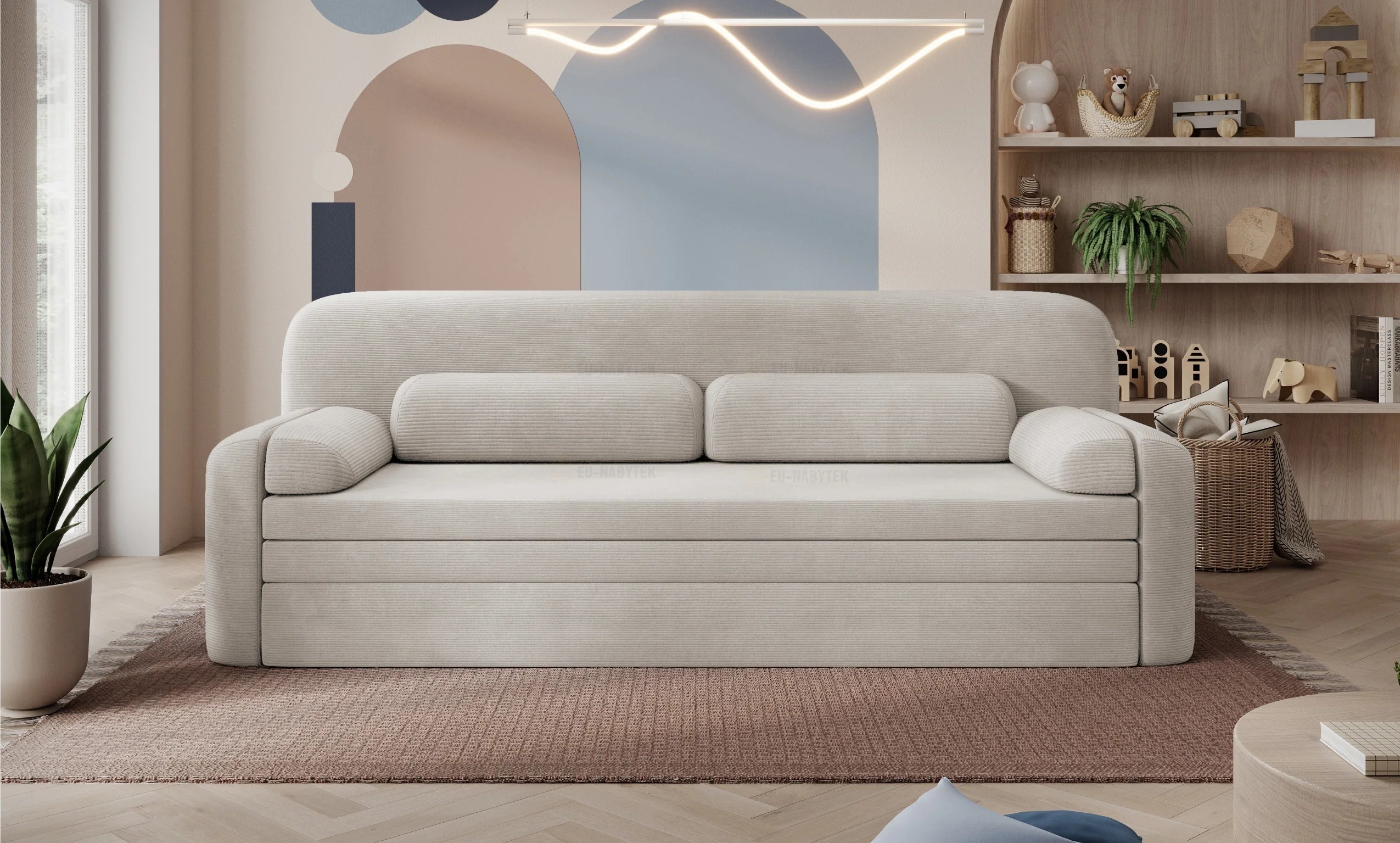 Moderní pohovka Ellas je elegantní kousek, který se stane nejen stylovým doplňkem vašeho interiéru, ale také praktickým řešením pro každodenní pohodlí. Samozřejmostí pohovky je rozklad a úložný prostor. Nabízí vše, co potřebujete – přes den pohodlné sezení, v noci prostorné lůžko a navíc skrytý úložný prostor pro lůžkoviny, deky či sezónní oblečení. Díky promyšlenému mechanismu se pohovka snadno rozkládá na plnohodnotné dvoulůžko o rozměru 144x198cm. Ideální pro hosty na příležitostné přespání. Pohovka je vybavena kvalitním sedákem vyplněným vysoce kvalitní polyuretanovou pěnou T2540 o tloušťce 10 cm, doplněnou 4cm vrstvou pro maximální komfort při sezení i spánku. Celkové rozměry pohovky jsou 236x89x87cm. Čalouněná je kvalitní látkou Sola 04. V nabídce ji naleznete i v jiném barevném provedení.