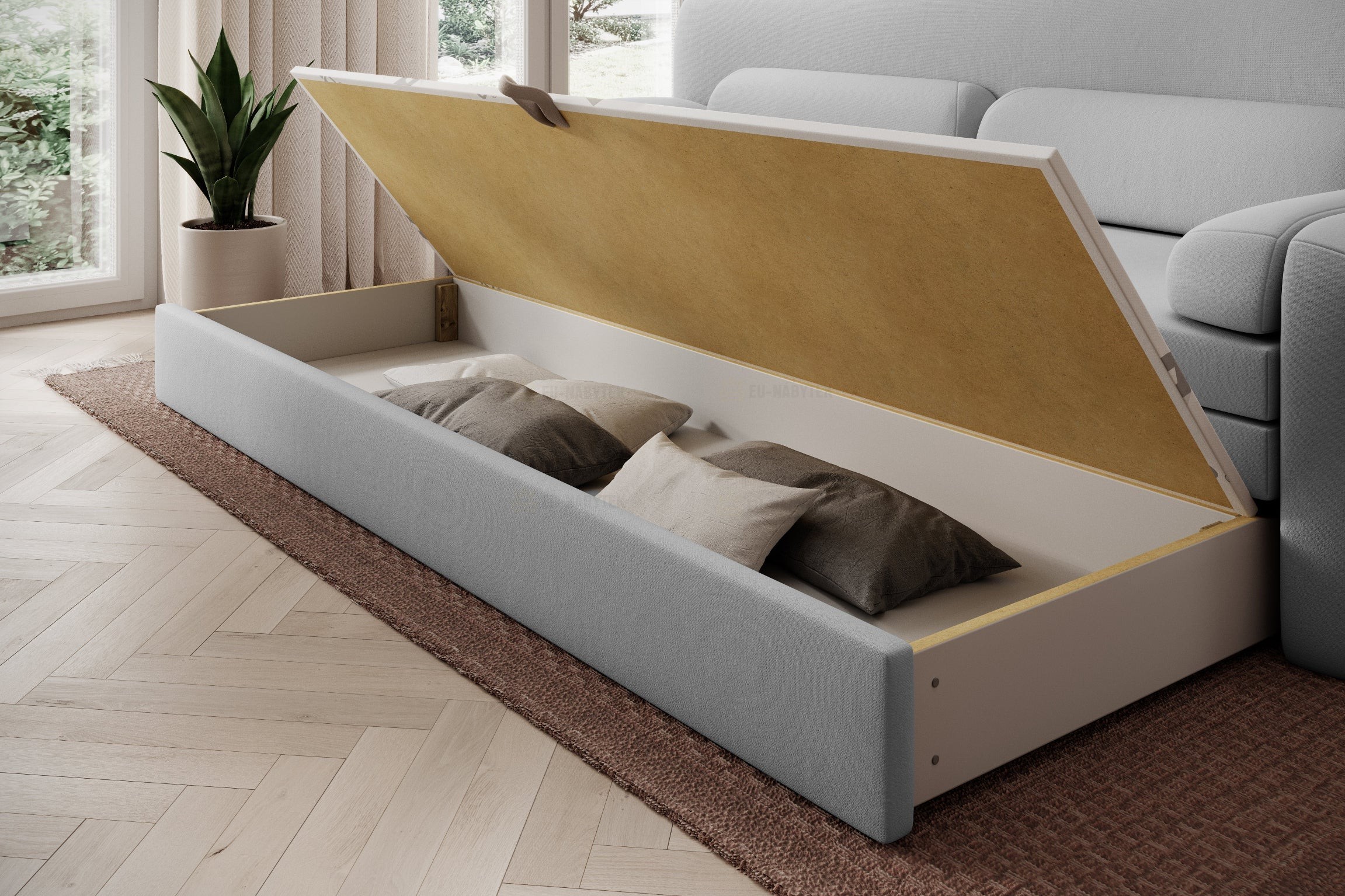 Moderní pohovka Ellas je elegantní kousek, který se stane nejen stylovým doplňkem vašeho interiéru, ale také praktickým řešením pro každodenní pohodlí. Samozřejmostí pohovky je rozklad a úložný prostor. Nabízí vše, co potřebujete – přes den pohodlné sezení, v noci prostorné lůžko a navíc skrytý úložný prostor pro lůžkoviny, deky či sezónní oblečení. Díky promyšlenému mechanismu se pohovka snadno rozkládá na plnohodnotné dvoulůžko o rozměru 144x198cm. Ideální pro hosty na příležitostné přespání. Pohovka je vybavena kvalitním sedákem vyplněným vysoce kvalitní polyuretanovou pěnou T2540 o tloušťce 10 cm, doplněnou 4cm vrstvou pro maximální komfort při sezení i spánku. Celkové rozměry pohovky jsou 236x89x87cm. Čalouněná je kvalitní látkou Sola 06. V nabídce ji naleznete i v jiném barevném provedení.