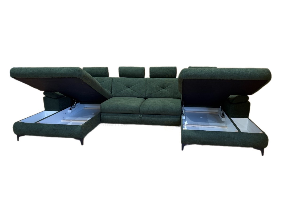 Sedací souprava Merry je ideální pro ty, kteří ocení komfort a pohodlí. Prostorná sedačka, která se hodí především do moderních obývacích pokojů. Tkanina vysoké kvality, masivní pevná kostra, s kvalitní PUR pěnou T30 v kombinaci pružin Faliste zaručují komfortní posezení. Samozřejmostí je možnost rozkladu pro příležitostné přespání a praktický úložný prostor, který se nachází v bočních otomanech. Plocha po rozložení je 292x125cm. Designovým prvkem jsou černé kovové nožky o výšce 10cm. Díky vysouvacím záhlavníkům si dopřejete ještě lepší odpočinek. Čalouněná je kvalitní látkou Monolith 77.