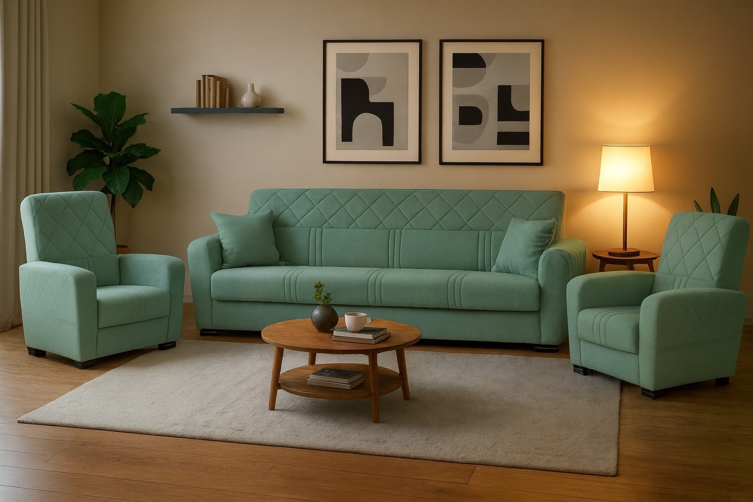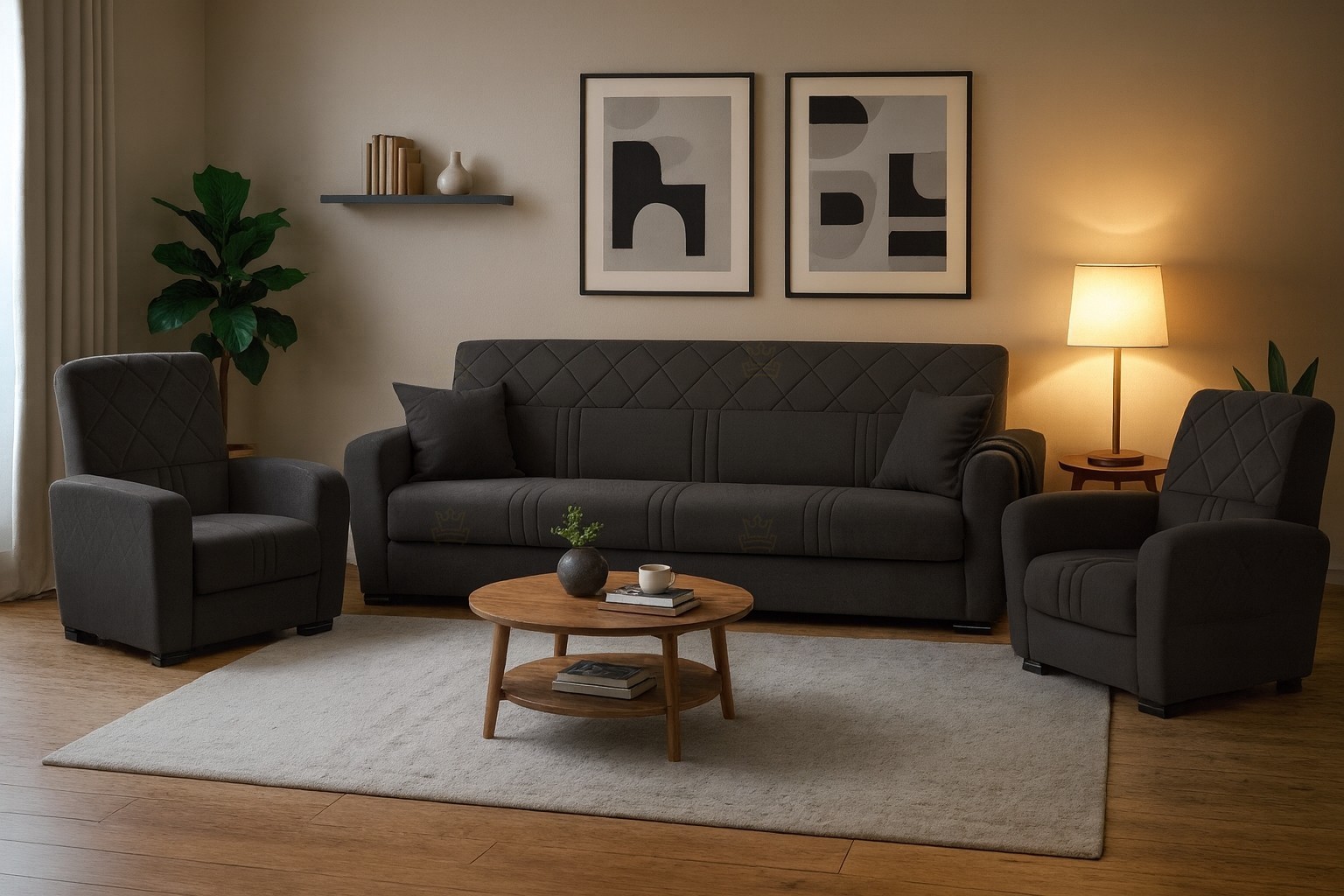 Pohodlná a prostorově nenáročná sedací souprava Calibra, která garantuje vysokou kvalitu provedení a dlouhou životnost. Sedací souprava má jednoduchý systém rozkládání včetně úložného prostoru, který se nachází v hlavní části pohovky. Zaujme především svým kvalitním prošitím a moderními designovými nožkami. Souprava se skládá ze dvou křesel (88x100x103cm) a pohovky (227x100x95cm). Po rozložení pohovka disponuje spací plochou o rozměru 196x133cm. Sestava je čalouněná kvalitní látkou Monolith 97.