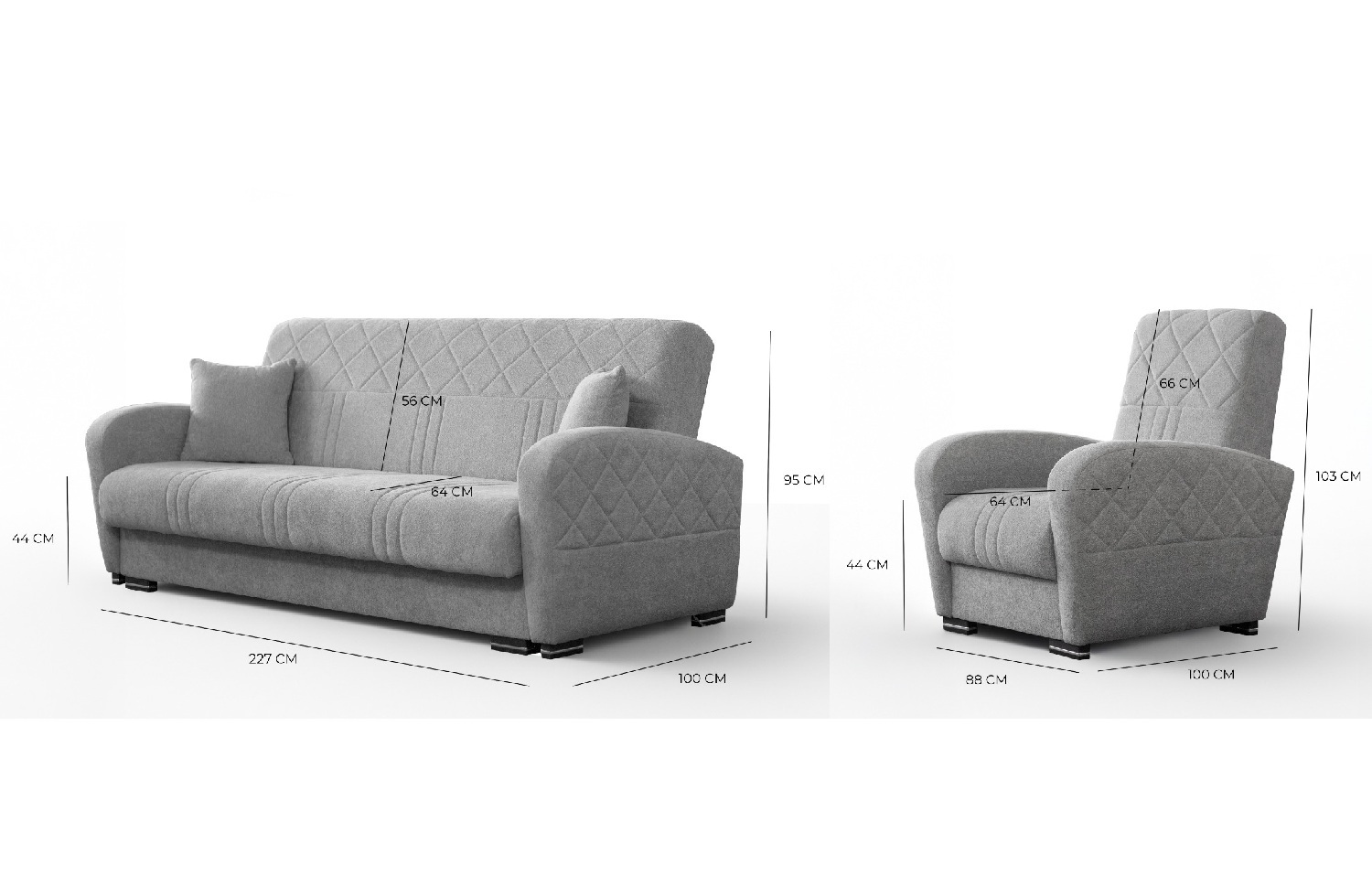 Pohodlná a prostorově nenáročná sedací souprava Calibra, která garantuje vysokou kvalitu provedení a dlouhou životnost. Sedací souprava má jednoduchý systém rozkládání včetně úložného prostoru, který se nachází v hlavní části pohovky. Zaujme především svým kvalitním prošitím a moderními designovými nožkami. Souprava se skládá ze dvou křesel (88x100x103cm) a pohovky (227x100x95cm). Po rozložení pohovka disponuje spací plochou o rozměru 196x133cm. Sestava je čalouněná kvalitní látkou Primo 72.