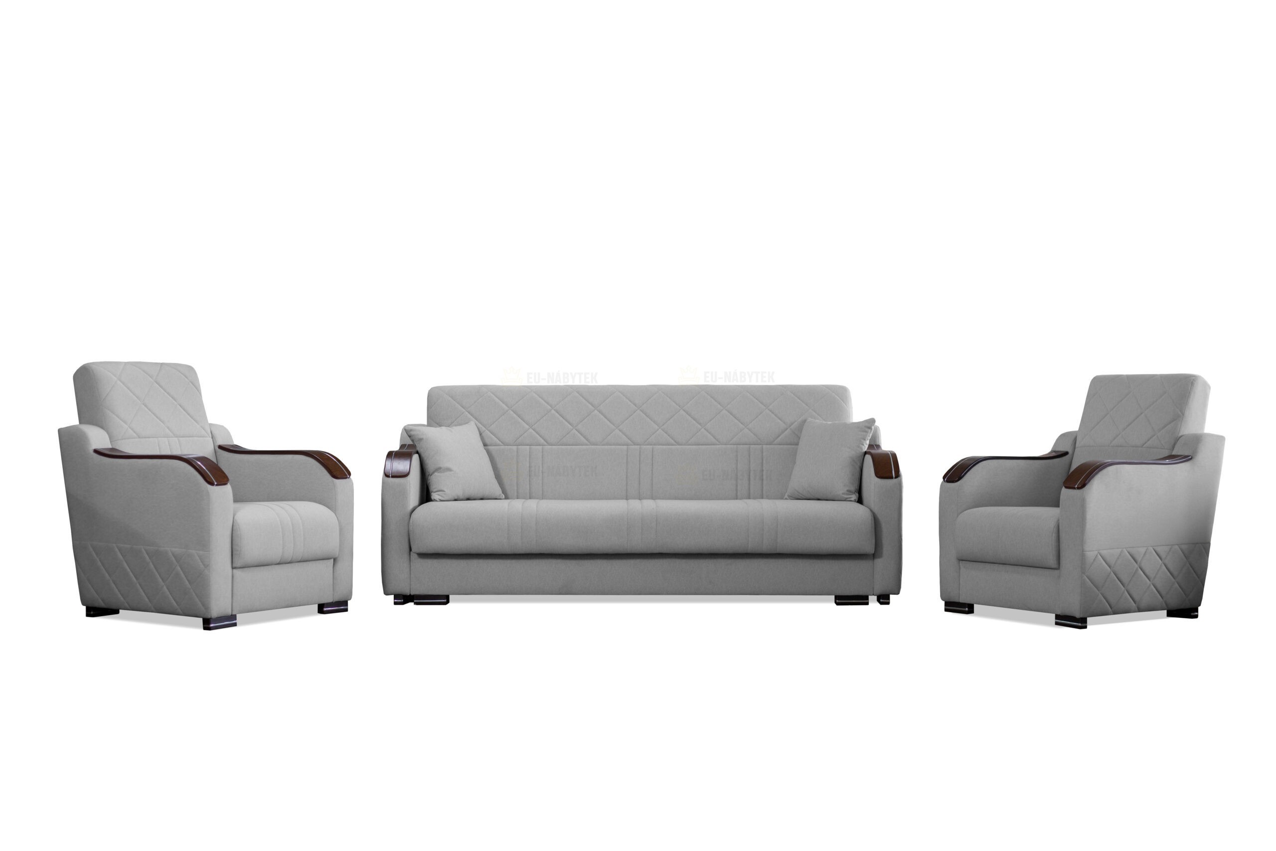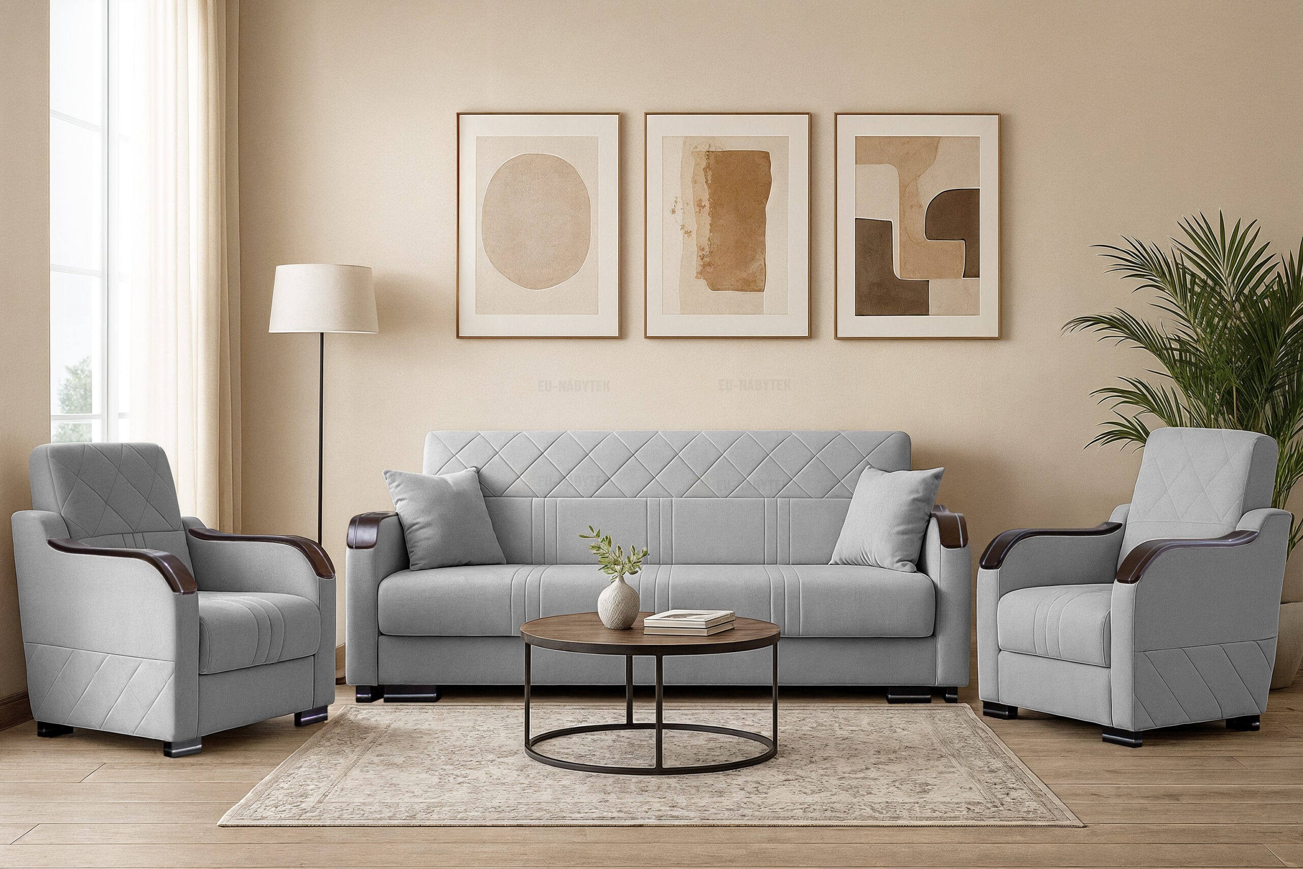 Pohodlná a prostorově nenáročná sedací souprava Koral, která garantuje vysokou kvalitu provedení a dlouhou životnost. Sedací souprava má jednoduchý systém rozkládání včetně úložného prostoru, který se nachází v hlavní části pohovky. Zaujme především svým kvalitním prošitím a moderními designovými područkami. Souprava se skládá ze dvou křesel (88x100x103cm) a pohovky (220x96x94cm). Po rozložení pohovka disponuje spací plochou o rozměru 195x132cm. Sestava je čalouněná kvalitní látkou Seal 85.