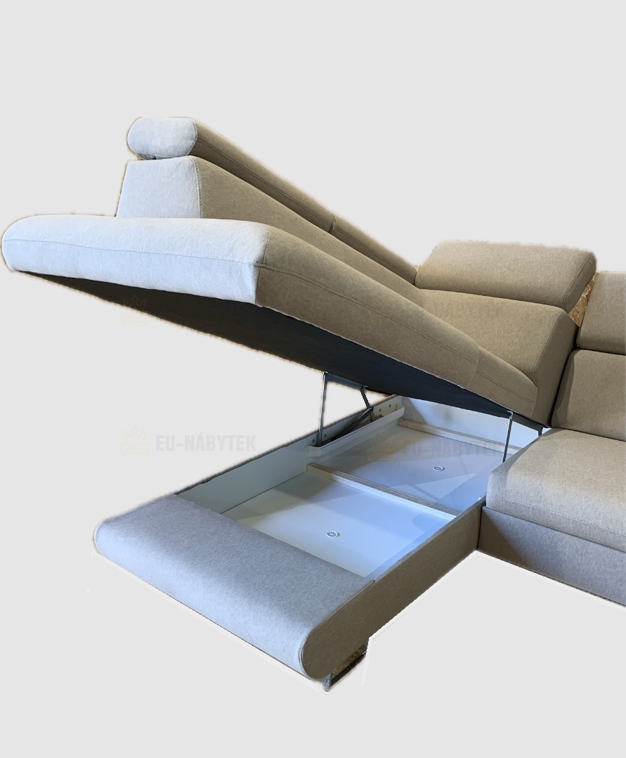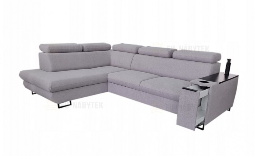 Luxusní prostorná sedací souprava Sagel vhodná pro ty nejnáročnější zákazníky. Sedačka nabízí vysoký komfort a pohodlí. Disponuje praktickým barem (28x98x58cm) s úložným prostorem, sadou vysunujících 3-zásuvek a držákem na pití. Vrchní deska na barové části je vyrobena z kvalitní LTD v černém provedení. Vzhledem k očalouněným zádům je vhodná do prostoru. Na sedáky jsou použity pružiny typu Faliste a vysokoelastická PUR pěna. Velkou výhodou jsou polohovatelné záhlavníky, díky kterým si dopřejete pohodlný odpočinek. Samozřejmostí je automatický úložný prostor v bočním otomanu a rozklad pro příležitostné spaní o rozměru 125x200cm . Čalouněná je kvalitní látkou Castel 15. Designové černé kovové nožky.