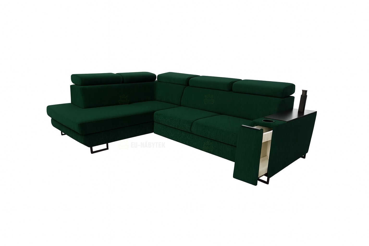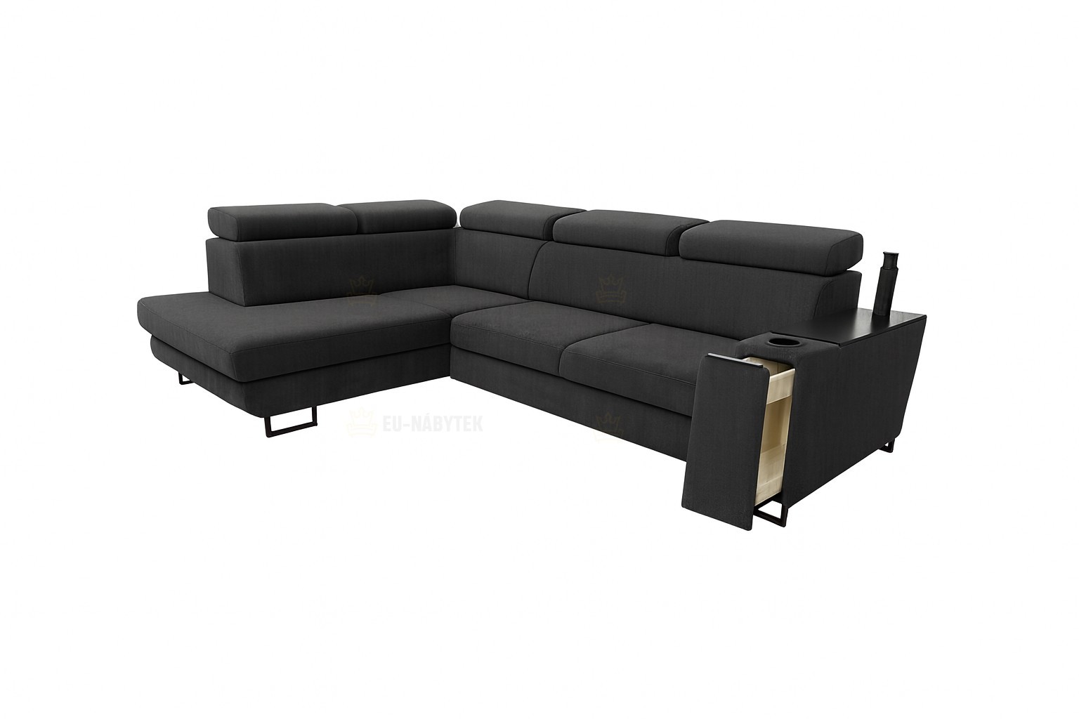 Luxusní prostorná sedací souprava Sagel vhodná pro ty nejnáročnější zákazníky. Sedačka nabízí vysoký komfort a pohodlí. Disponuje praktickým barem (28x98x58cm) s úložným prostorem, sadou vysunujících 3-zásuvek a držákem na pití. Vrchní deska na barové části je vyrobena z kvalitní LTD v černém provedení. Vzhledem k očalouněným zádům je vhodná do prostoru. Na sedáky jsou použity pružiny typu Faliste a vysokoelastická PUR pěna. Velkou výhodou jsou polohovatelné záhlavníky, díky kterým si dopřejete pohodlný odpočinek. Samozřejmostí je automatický úložný prostor v bočním otomanu a rozklad pro příležitostné spaní o rozměru 125x200cm . Čalouněná je kvalitní látkou Mono 244. Designové černé kovové nožky.