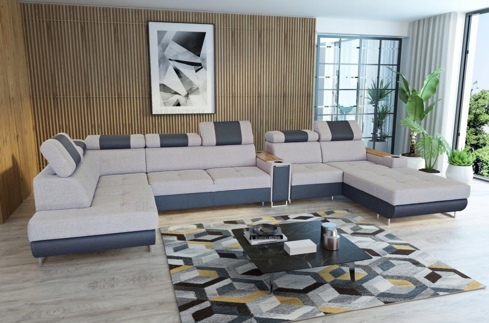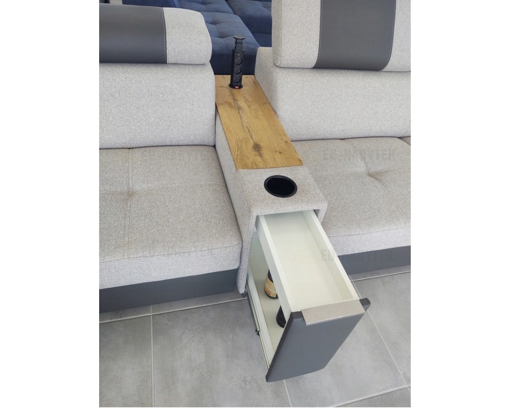 Luxusní prostorná sedací souprava Sergia vhodná pro ty nejnáročnější zákazníky. Sedačka nabízí vysoký komfort a pohodlí. Disponuje praktickým barem (28x98x58cm) s úložným prostorem, sadou vysunujících zásuvek a dvěmi držáky na pití. Vrchní deska na barové části je vyrobena z kvalitní LTD. Vhodná do prostorných obývacích pokojů. Vzhledem k očalouněným zádům je vhodná do prostoru. Na sedáky jsou použity pružiny typu Faliste a vysokoelastická PUR pěna. Velkou výhodou jsou polohovatelné záhlavníky, díky kterým si dopřejete pohodlný odpočinek. Samozřejmostí je automatický úložný prostor v bočních otomanech a rozklad pro příležitostné spaní o rozměru 125x196cm. Čalouněná je kvalitní látkou Vogue 13. Designové kovové nožky. Na hlavním obrázku je pravý roh.