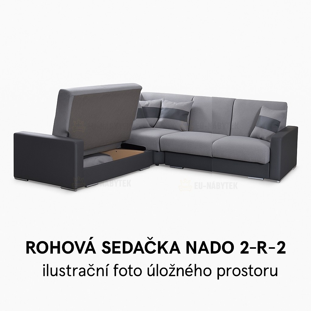 Velmi elegantní, moderní a perfektně zpracovaná sedací souprava Nado. Sedačka má praktické dvě rozkládací části o rozměru 123x120cm a zároveň disponuje dvěmi úložnými prostory. Rozkládání je řešeno jednoduchým a praktickým systémem "klik - klak". Vnitřní výplň tvoří matrace typu bonell s pružinovou vystýlkou a kvalitní PUR pěnou. Není vhodná na umístění do volného prostoru. Čalouněná je kvalitní látkou Inari 96. Zakoupit ji lze v mnoha barevných variantách, které naleznete na našich stránkách.