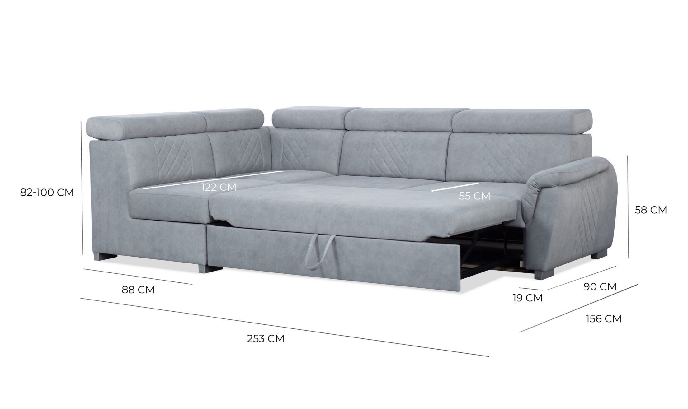 Rohová sedačka Remona je ideální volbou pro moderní obývací pokoj, kde se snoubí styl, komfort a praktičnost. Tato rozkládací sedačka nabízí prostorné lůžko pro příležitostné spaní a také velký úložný prostor na deky či polštáře. Díky kvalitní výplni sedáku z pružin Faliste a vysokoelastické pěny poskytuje maximální pohodlí při každodenním sezení. Nastavitelné opěrky hlavy zajišťují perfektní ergonomii, zatímco elegantní design a pečlivé zpracování dělají ze sedačky Remona atraktivní dominantu každého interiéru. S šířkou 253 cm a hloubkou 156 cm skvěle zapadne do středně velkých i větších obývacích pokojů. Pokud hledáte moderní rohovou sedačku s rozkladem, která dlouho vydrží a zároveň skvěle vypadá, Remona je ideální volbou. Vyberte si potahovou látku dle vlastního výběru. Na hlavní fotce je sedačka čalouněná látkou Seal 85.