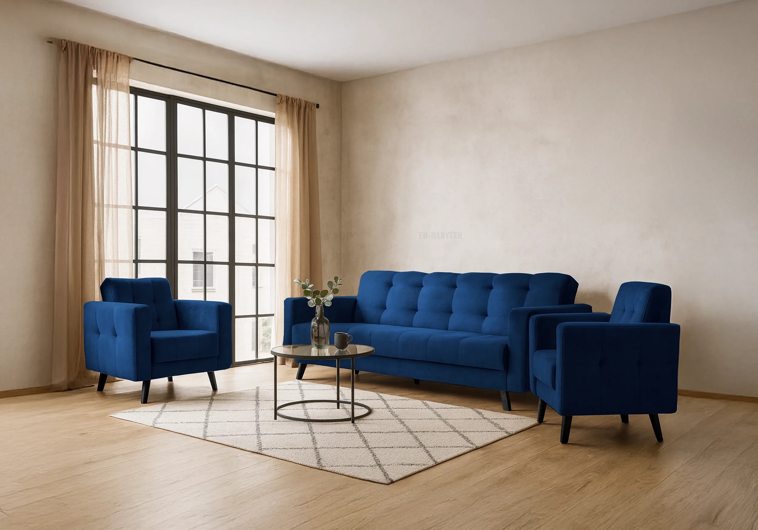 Zvolte komfort a styl zároveň. Sestava LINIA nabízí sofistikované řešení pro moderní obývací pokoj. Tento elegantní set tvoří prostorná rozkládací pohovka a dvě pohodlné křesla. Díky černým dřevěným nožkám a decentnímu pikování na opěrkách a bocích nábytku působí set velmi nadčasově a vkusně. Set Linia představuje ideální kombinaci funkčnosti a elegantního designu. Díky přeměnitelnosti pohovky na lůžko je praktickým řešením pro menší i větší byty. Poskytne pohodlné místo k sezení i spánku. Plocha po rozložení je 118x195cm. Luxusní a nadčasový vzhled, který snadno zapadne do různých stylů interiéru od moderního po minimalistický nebo industriální. Set je čalouněný kvalitní látkou Kronos 43. V nabídce i v jiném barevném provedení.
