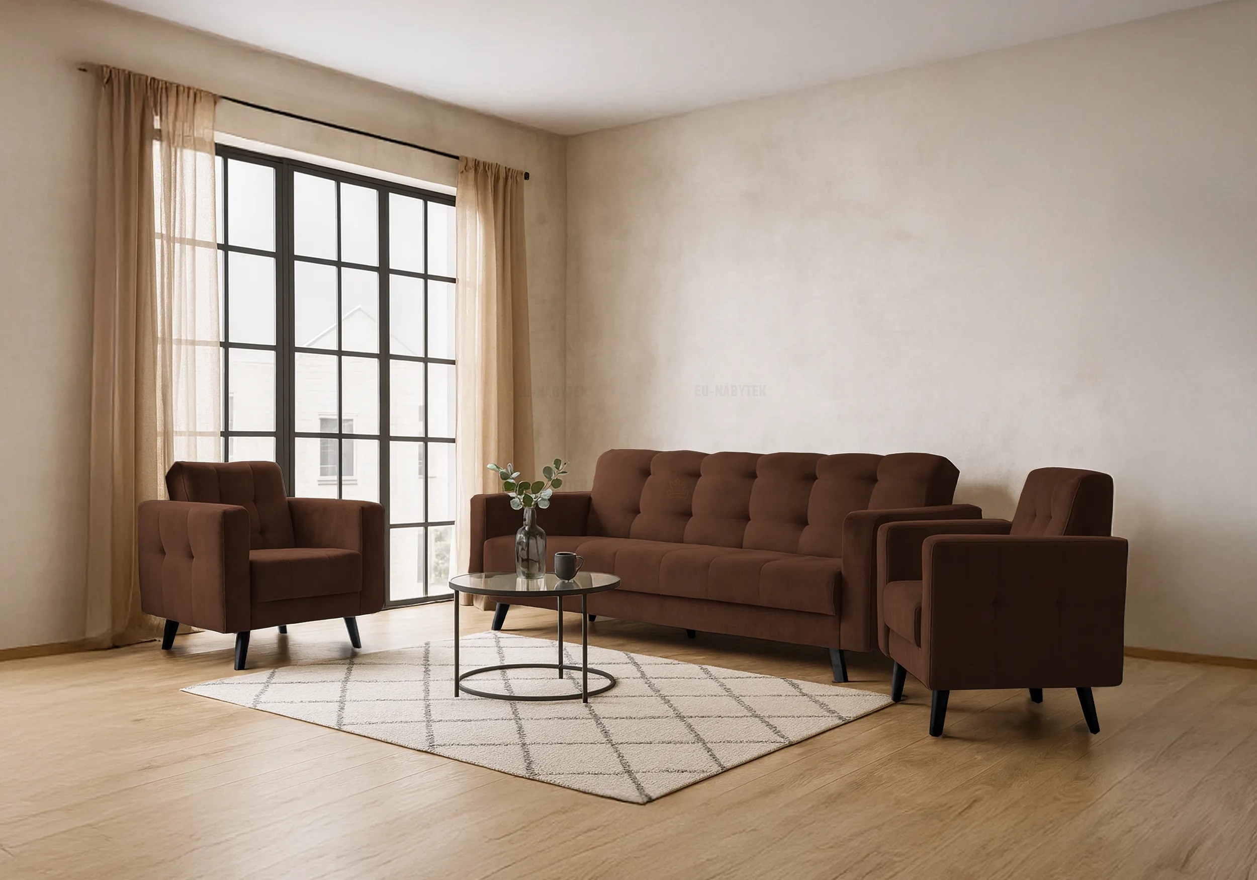 Zvolte komfort a styl zároveň. Sestava LINIA nabízí sofistikované řešení pro moderní obývací pokoj. Tento elegantní set tvoří prostorná rozkládací pohovka a dvě pohodlné křesla. Díky černým dřevěným nožkám a decentnímu pikování na opěrkách a bocích nábytku působí set velmi nadčasově a vkusně. Set Linia představuje ideální kombinaci funkčnosti a elegantního designu. Díky přeměnitelnosti pohovky na lůžko je praktickým řešením pro menší i větší byty. Poskytne pohodlné místo k sezení i spánku. Plocha po rozložení je 118x195cm. Luxusní a nadčasový vzhled, který snadno zapadne do různých stylů interiéru od moderního po minimalistický nebo industriální. Set je čalouněný kvalitní látkou Kronos 06. V nabídce i v jiném barevném provedení.