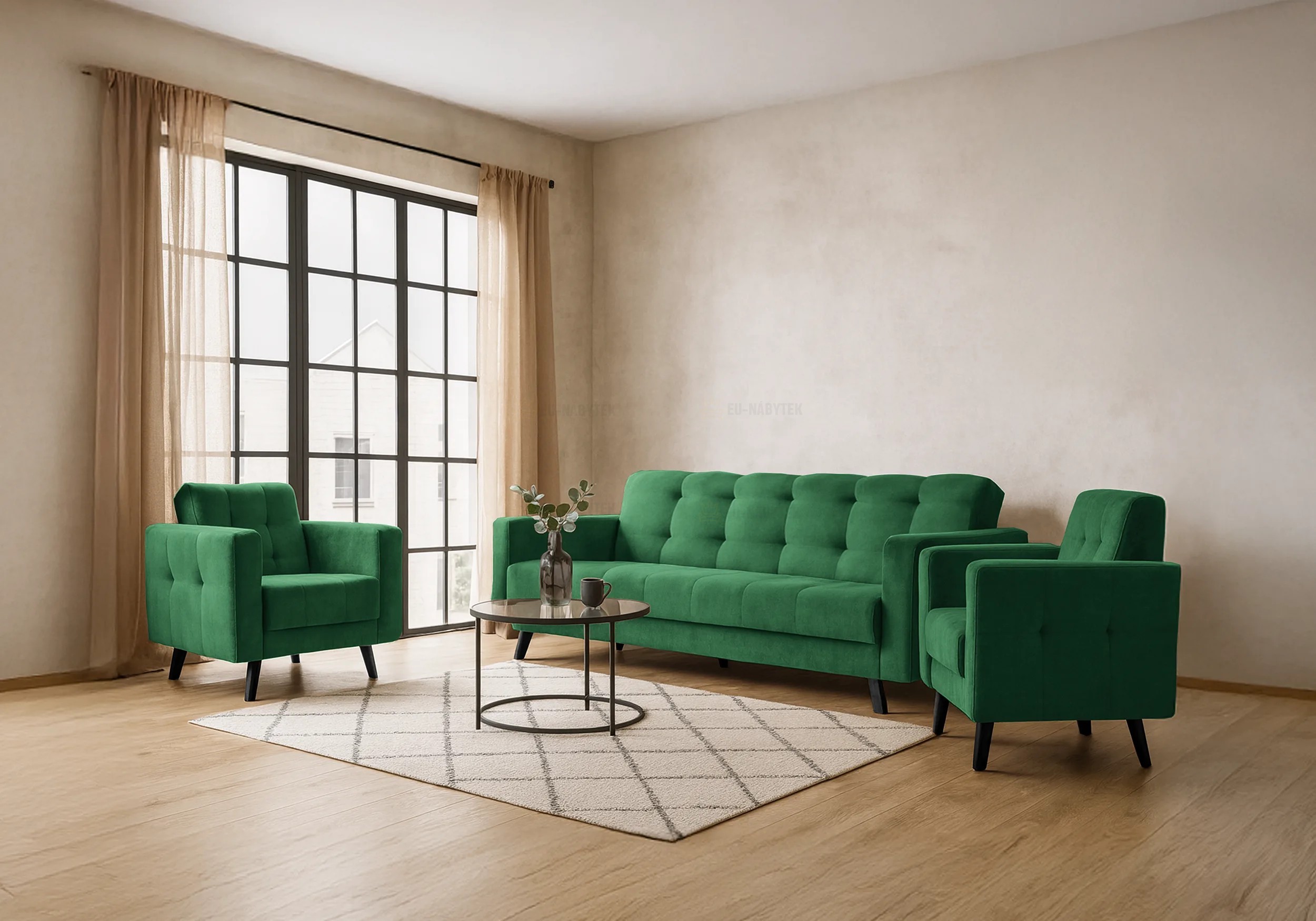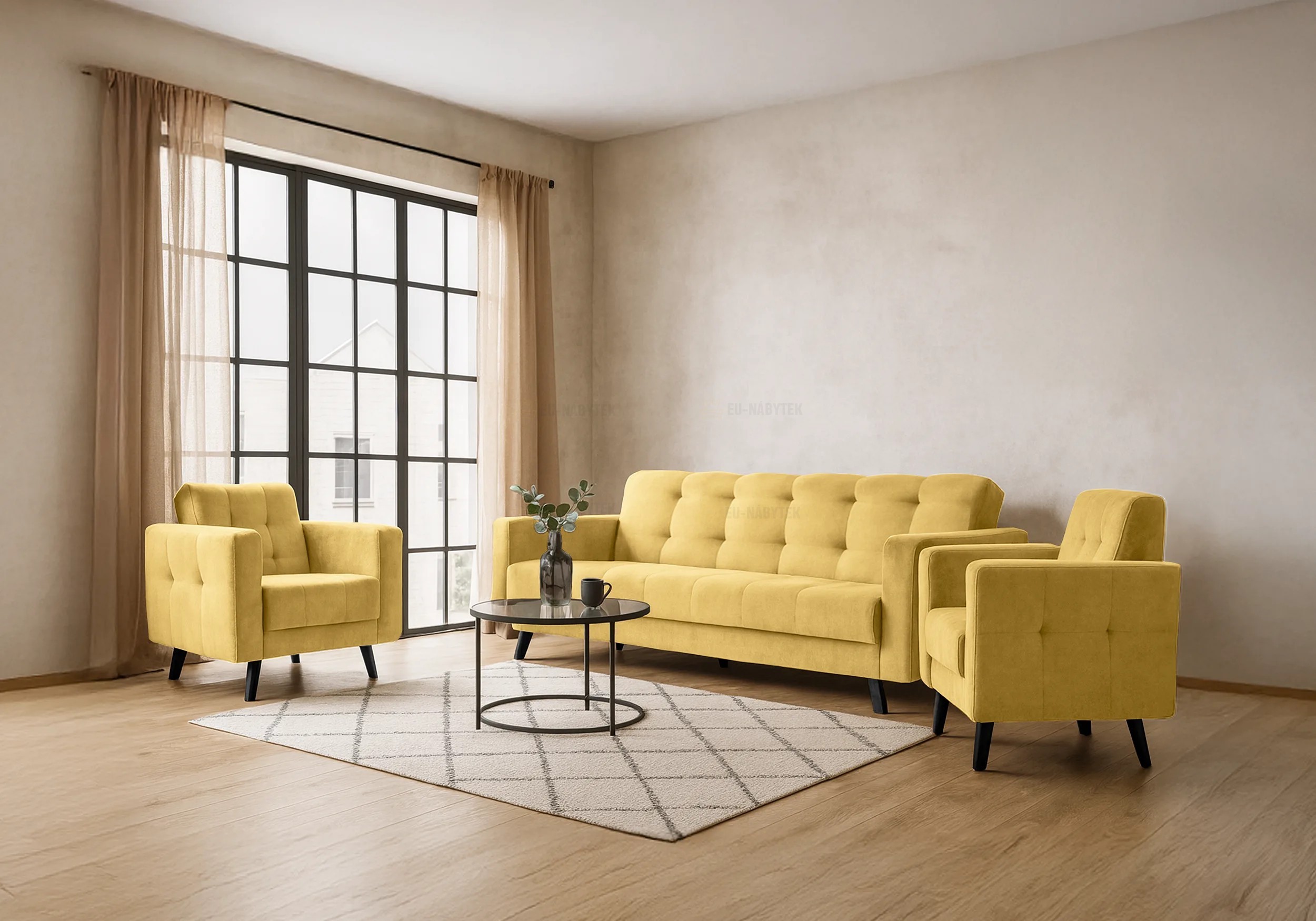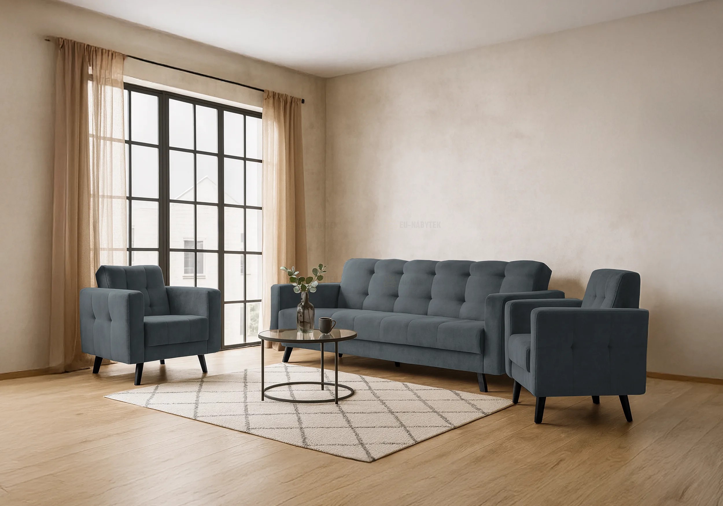 Zvolte komfort a styl zároveň. Sestava LINIA nabízí sofistikované řešení pro moderní obývací pokoj. Tento elegantní set tvoří prostorná rozkládací pohovka a dvě pohodlné křesla. Díky černým dřevěným nožkám a decentnímu pikování na opěrkách a bocích nábytku působí set velmi nadčasově a vkusně. Set Linia představuje ideální kombinaci funkčnosti a elegantního designu. Díky přeměnitelnosti pohovky na lůžko je praktickým řešením pro menší i větší byty. Poskytne pohodlné místo k sezení i spánku. Plocha po rozložení je 118x195cm. Luxusní a nadčasový vzhled, který snadno zapadne do různých stylů interiéru od moderního po minimalistický nebo industriální. Set je čalouněný kvalitní látkou Kronos 29. V nabídce i v jiném barevném provedení.