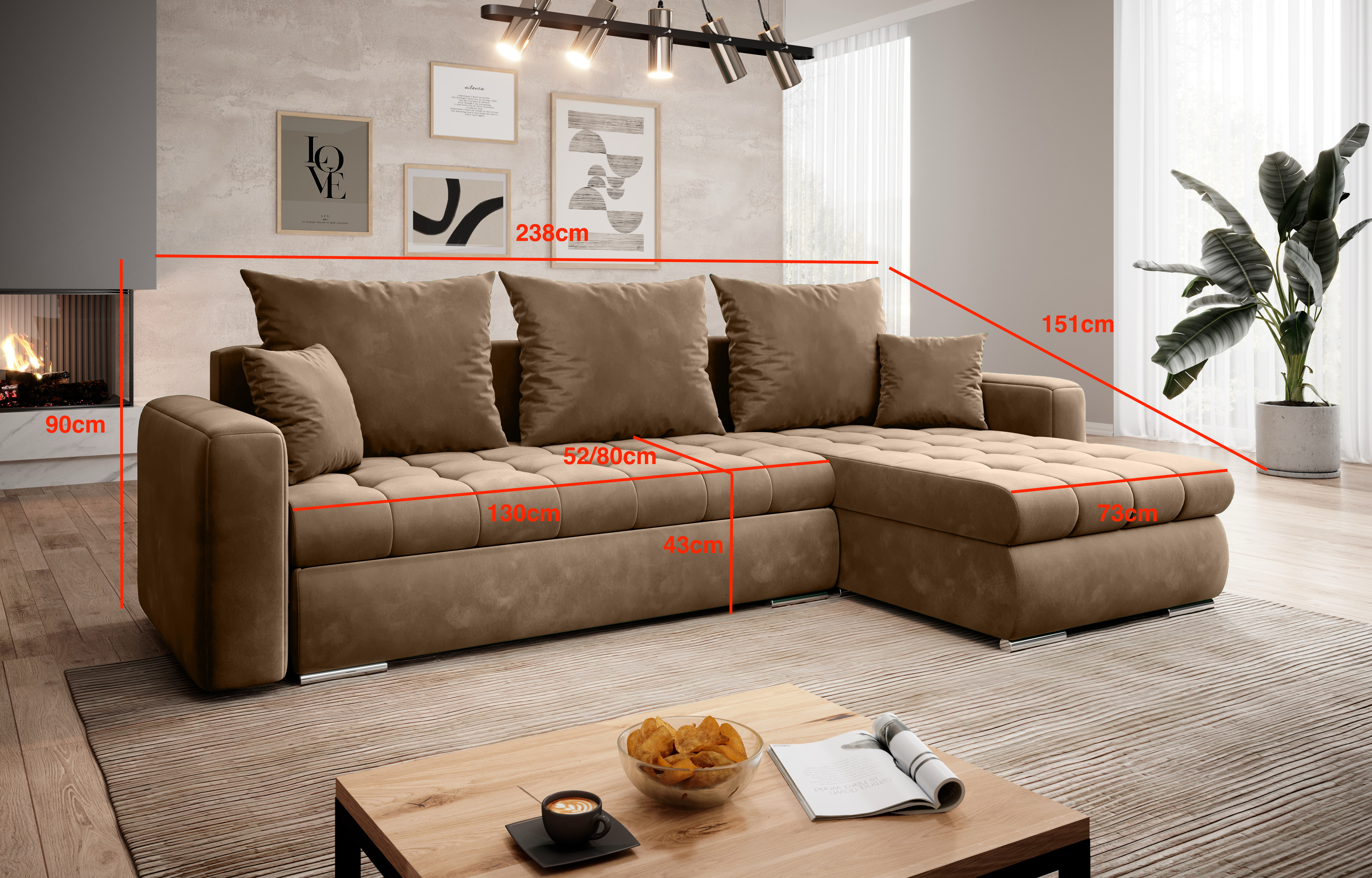 Elegantní rohová sedačka Canvia v nadčasovém designu je ideální volbou pro každodenní relaxaci i příležitostné přespání. Díky možnosti snadného rozkladu během chvilky vytvoříte pohodlné lůžko pro návštěvu o rozměru 128x202cm. Kvalitní výplň z pružin Bonell v kombinaci s PUR pěnou zajišťuje optimální podporu těla, vysoký komfort sezení i dlouhou životnost. Sedačka zaujme svým moderním vzhledem, čistými liniemi a výrazným prošíváním sedací části. Prostorné sedáky a opěrné polštáře poskytují maximální pohodlí při odpočinku s rodinou nebo přáteli. Rohové provedení efektivně využívá prostor a nabízí dostatek místa k sezení. Čalouněná je kvalitní hydrofobní látkou Monolith 92.