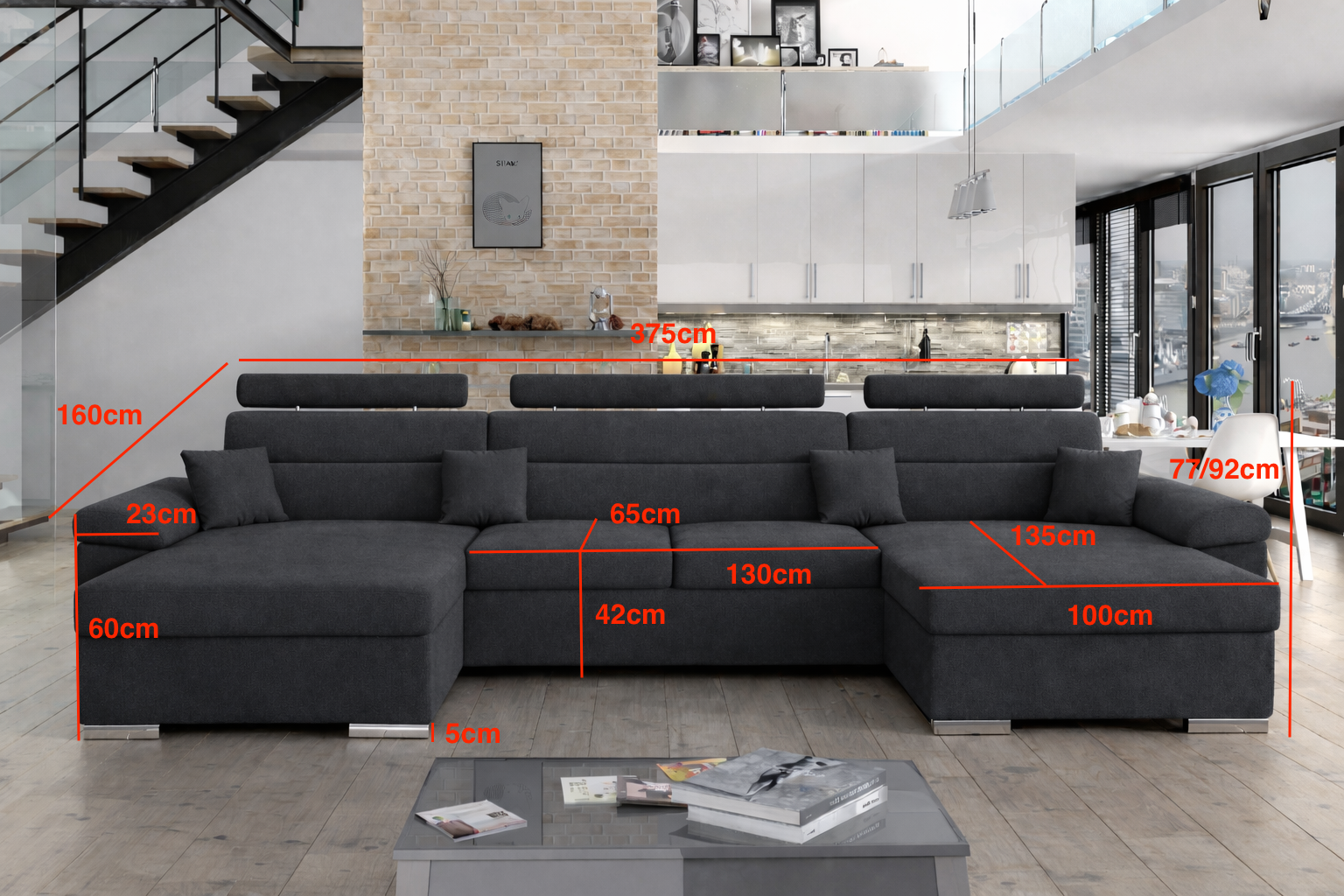Sedací souprava LEILA je ideální pro ty, kteří ocení komfort a pohodlí. Prostorná sedačka, která se hodí do prostorných obývacích pokojů. Tkanina vysoké kvality, masivní pevná kostra, s kvalitní PUR pěnou T30 zaručují komfortní posezení. Plocha po rozložení je 130x325cm. Sedací souprava má také spoustu úložného prostoru, které se nachází v bočních otomanech. Designové nožky jsou z kovu, délka je 10cm. Barevné provedení - Orinoco 37 a Orinoco 96. Tuto sedačku nabízíme v několika barevných provedeních.