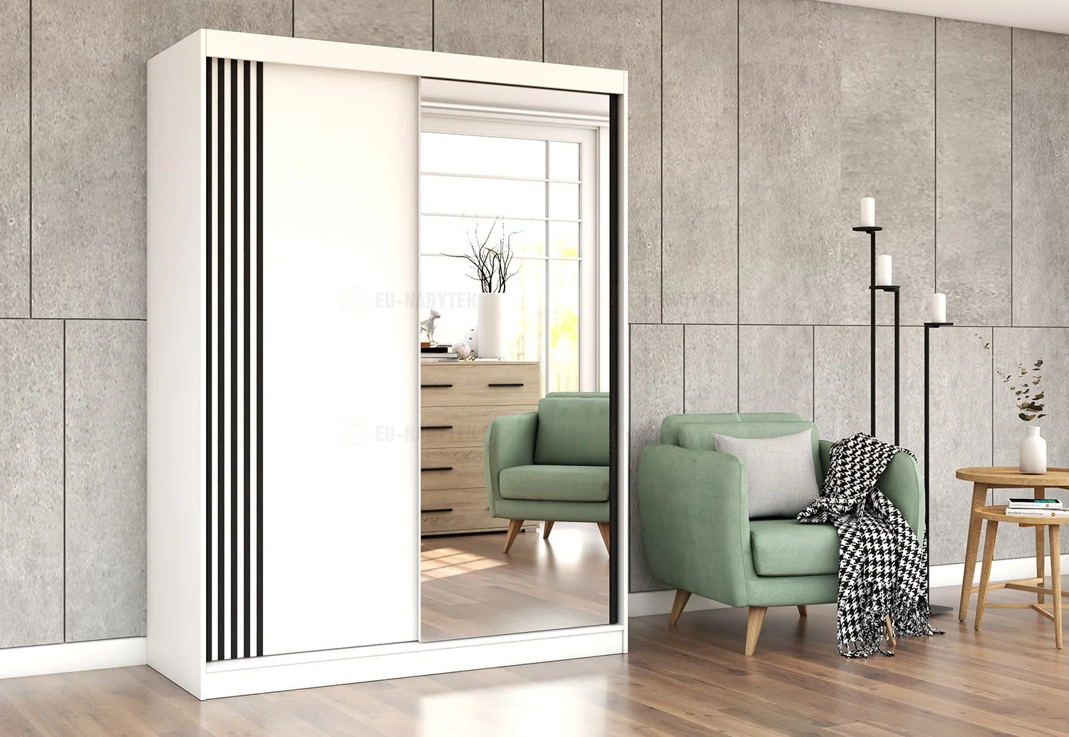 Moderní posuvná šatní skříň v minimalistickém stylu, která skvěle zapadne do současných interiérů. Kombinace čistě bílé plochy, elegantních černých vertikálních lamel a velkého zrcadla vytváří designový prvek, který prostor nejen doplní, ale také opticky zvětší a prosvětlí. Skříň je vybavena praktickými posuvnými dveřmi, díky nimž je ideální i do menších místností, kde není prostor pro klasické otevírání dveří. Jedna část dveří je doplněna velkým zrcadlem, které je praktické pro každodenní oblékání. Minimalistický vzhled podtrhují dekorativní černé lamely, které dodávají skříni moderní a elegantní charakter. Díky nadčasové kombinaci bílé a černé barvy se skříň snadno kombinuje s různými styly nábytku. Skříň nabízí dostatek úložného prostoru pro oblečení i doplňky a je vhodná do ložnice, šatny i předsíně. Celkové rozměry jsou (šxvxh) 150x200x61cm. Dodáváno v demontu.