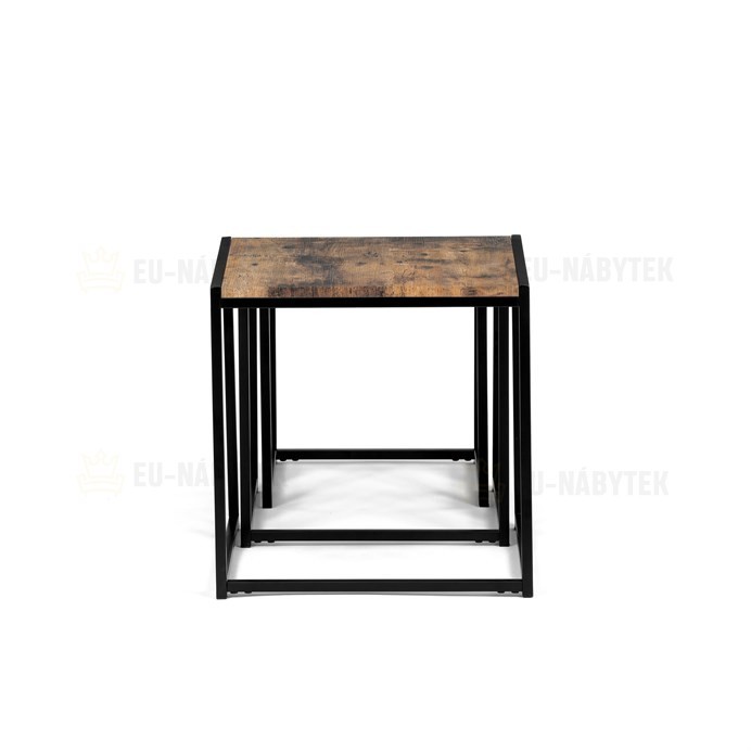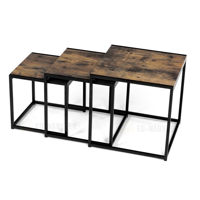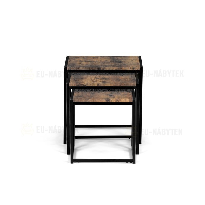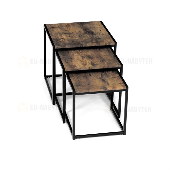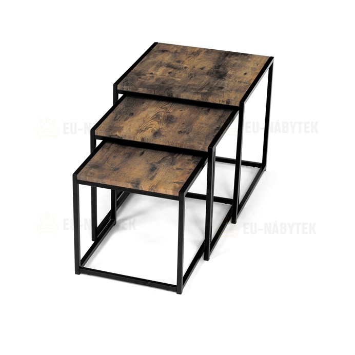 Set 3 ks přístavných nebo odkládacích stolků přinese do Vašeho domova praktičnost, variabilitu, ale také industriální šarm. Stolky můžete rozmístit jednotlivě po interiéru, kde Vám vytvoří zajímavé odkládací prvky v různých výškových hladinách. A nebo společně povytažené, kde vytvoříte velkou obdélníkovou stupňovitou odkládací plochu. Velkou výhodou je možnost zasunutí stolků do sebe, což oceníte při úklidu, skladování nebo při potřebě většího prostoru. Čtvercové desky z MDF v dekoru staré dřevo harmonicky doplňují černá kovová konstrukce, která tvoří rovněž nohy a celkově stolky zpevňuje. Stolek jistě zaujmou nejen svým nadčasovým designem, ale i variabilitou a praktičností. Desky májí rozměr 35 x 35 x 35 , 40 x 40 x 40 a 45 x 45 x 45 cm, tloušťku 1,5 cm. Konstrukce je čtvercového průřezu, na spodních plochách opatřená plastovými kluzáky. Nosnost jednotlivého stolku je do 15 kg.