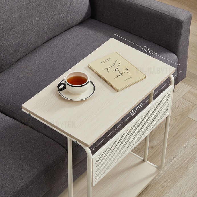 Odkládací stolek s rozměry 55 × 32 × 65,8 cm kombinuje desku a spodní polici z MDF s dekorem běleného dubu a pevnou kovovou konstrukcí v bílé barvě. Matný povrch desky usnadňuje údržbu a odolává běžnému opotřebení. Kovová konstrukce je doplněna o čtyři kolečka, která umožňují snadnou mobilitu stolku a jeho flexibilní umístění v prostoru. Praktický odkládací prostor na spodní polici nabízí další místo pro uložení drobných předmětů nebo dekorací. Kompaktní rozměry a stabilní provedení zajišťují univerzální využití v domácnostech i kancelářích.